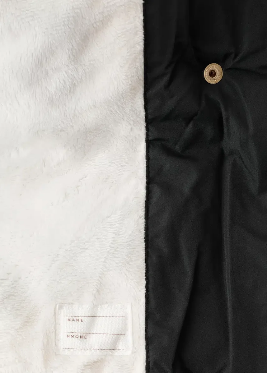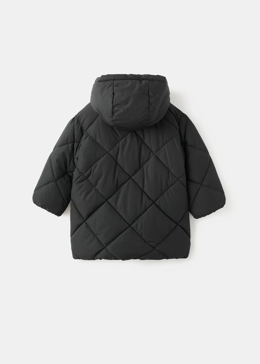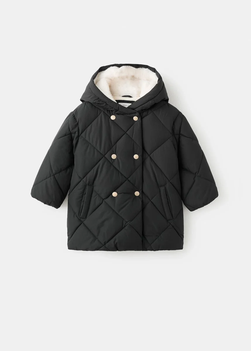 Prošívaná látka. Podšívka s kožešinovým efektem. Rovný střih. Střední délka. S kapucí. Kapuce s detailem ze syntetické srsti. Dlouhé rukávy. Zapínání na zip a knoflíky vpředu. Dvě boční kapsy