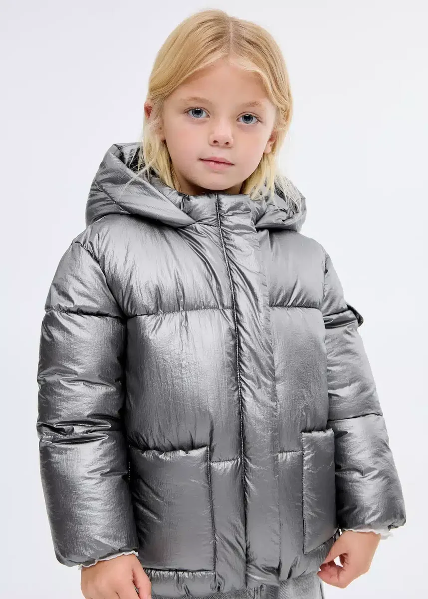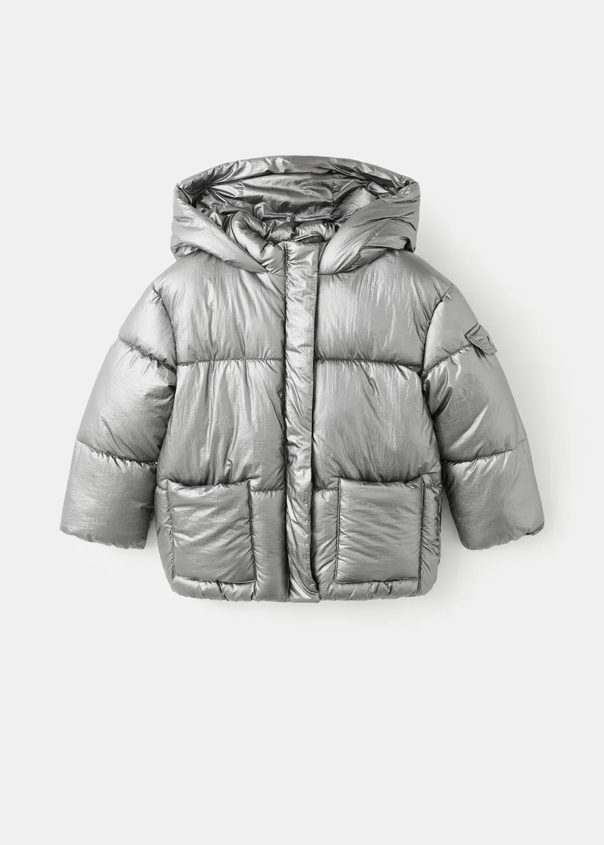 Prošívaná tkanina. Metalická tkanina. Krátký střih. S kapucí. Dlouhé rukávy. Zapínání na zip. Dvě přední kapsy. Vánoční kolekce.