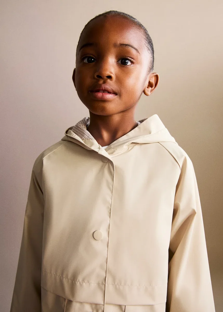 Vodotěsný design. Rovný střih. Kapuce. Dlouhé rukávy. Štítek pro osobní údaje. Vnitřní podšívka. Zapínání na knoflíky vpředu.