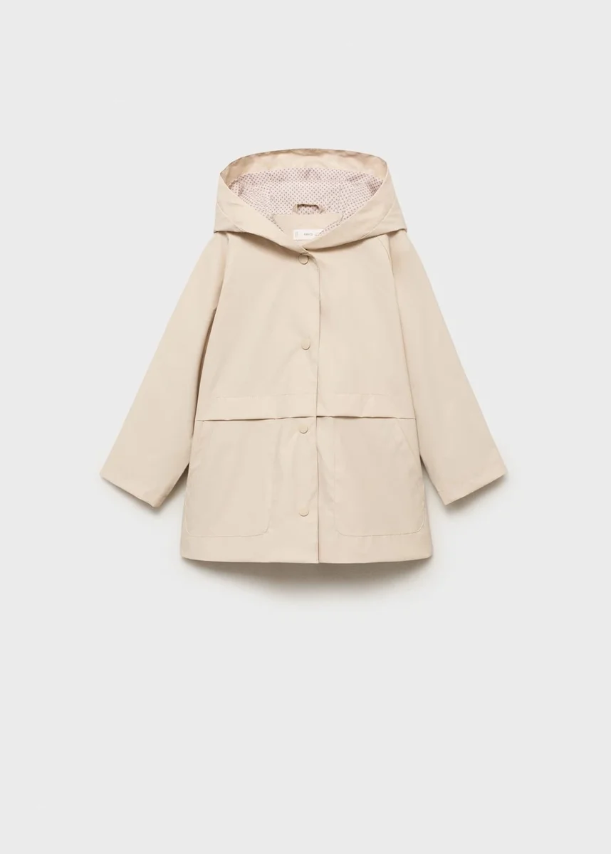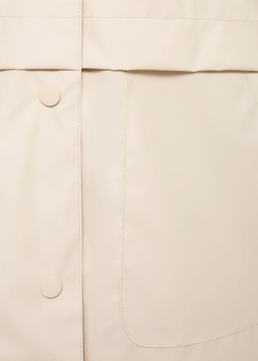 Vodotěsný design. Rovný střih. Kapuce. Dlouhé rukávy. Štítek pro osobní údaje. Vnitřní podšívka. Zapínání na knoflíky vpředu
