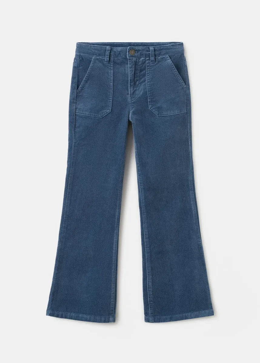 Bavlněná tkanina. Elastická tkanina. Dlouhý střih. Rozšířený střih. Rozšířený střih. Měkký povrch. Poutka na opasek. Dvě přední kapsy. Dvě našité kapsy vzadu. Zapínání na knoflíky