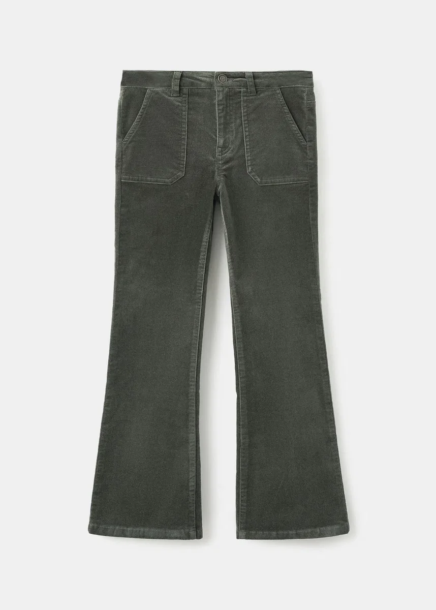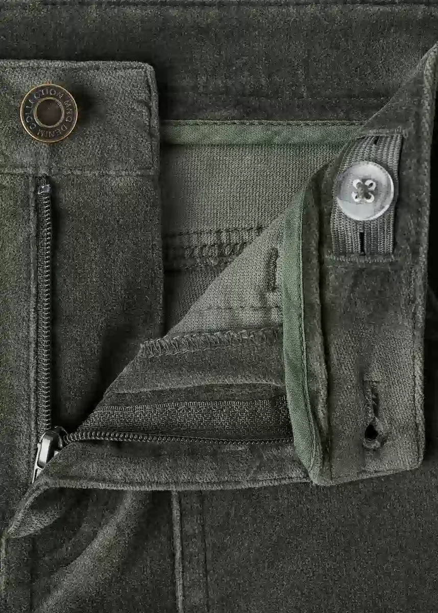 Bavlněná tkanina. Elastická tkanina. Dlouhý střih. Rozšířený střih. Rozšířený střih. Měkký povrch. Poutka na opasek. Dvě přední kapsy. Dvě našité kapsy vzadu. Zapínání na knoflíky