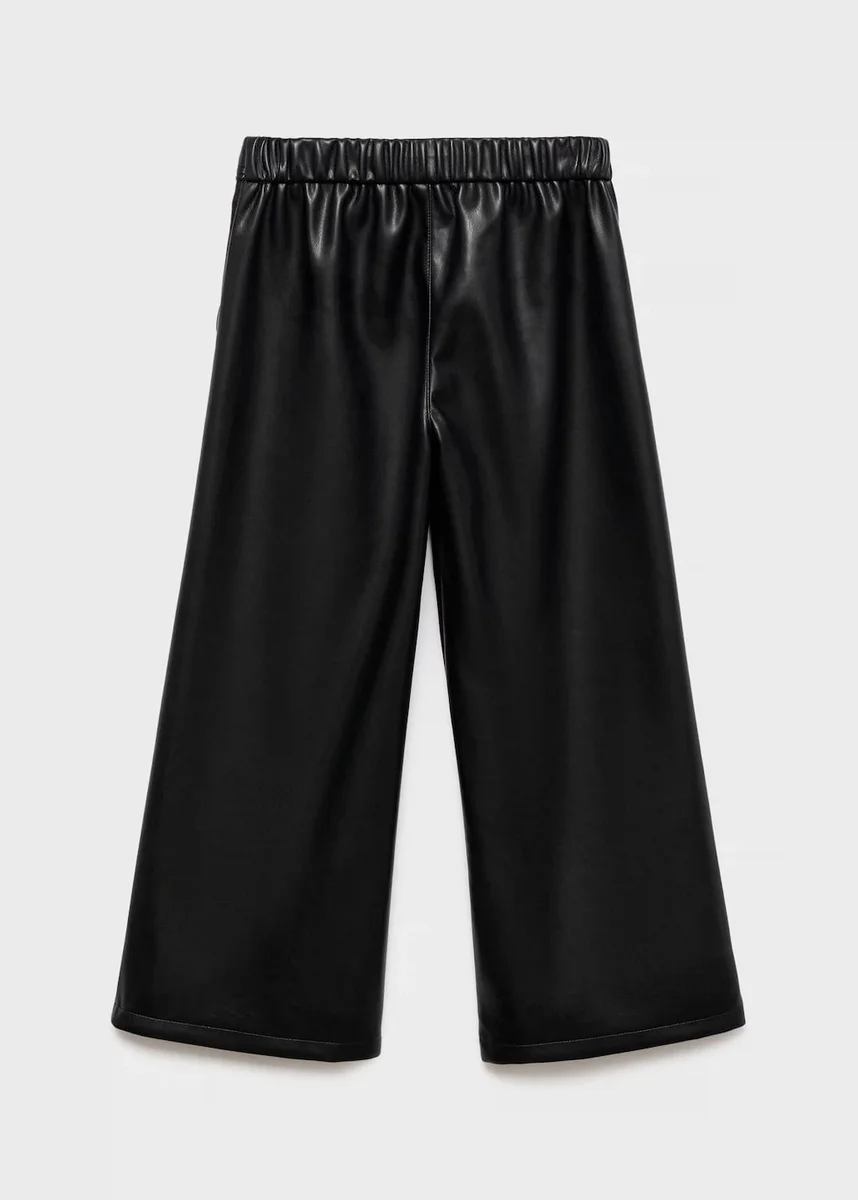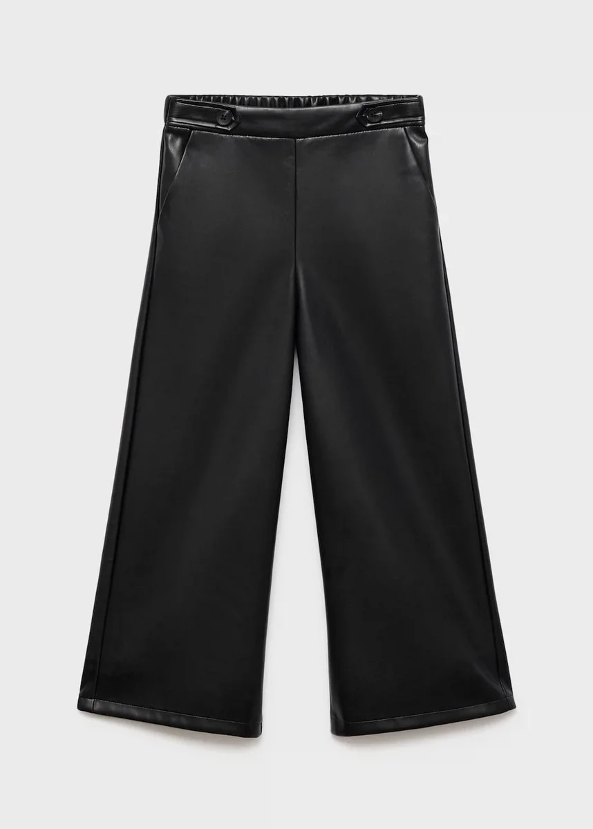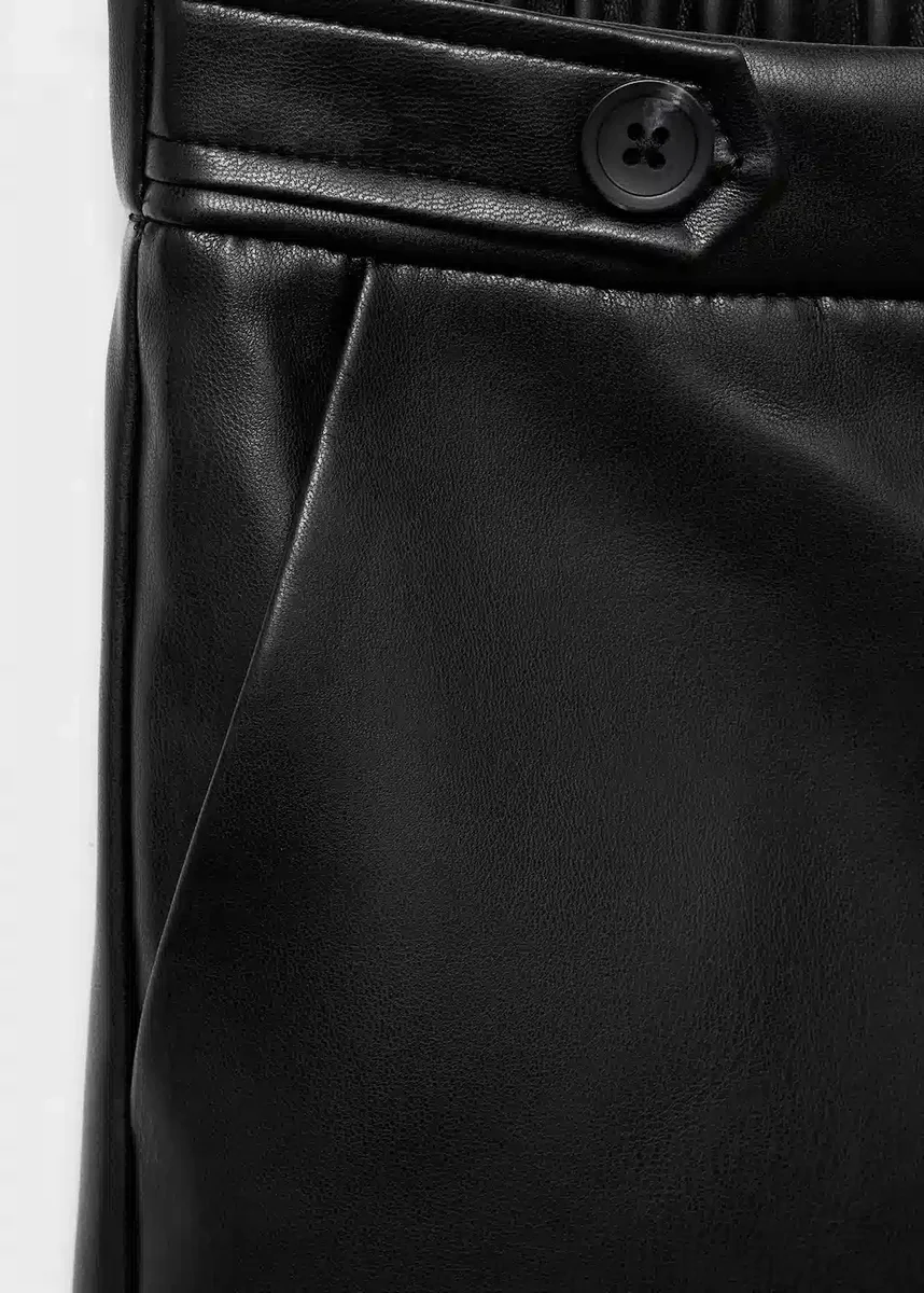 Tyto rovné a dlouhé kalhoty jsou vyrobeny z umělé kůže a mají nastavitelný elastický pas. Mají dvě boční kapsy a ozdobné knoflíky.