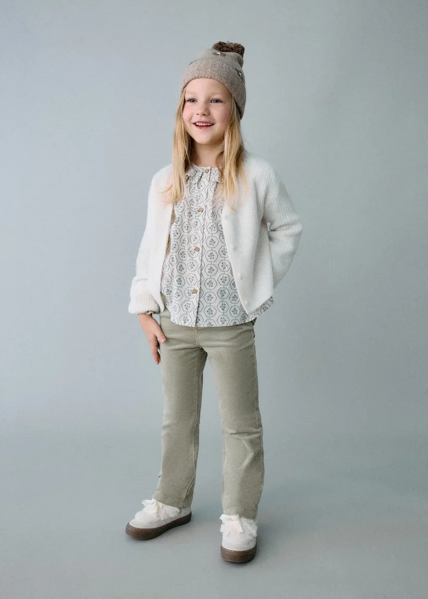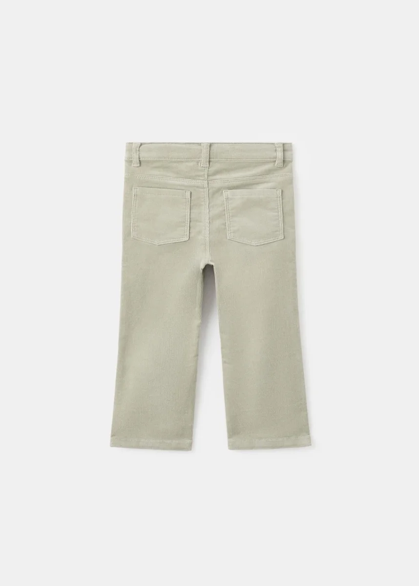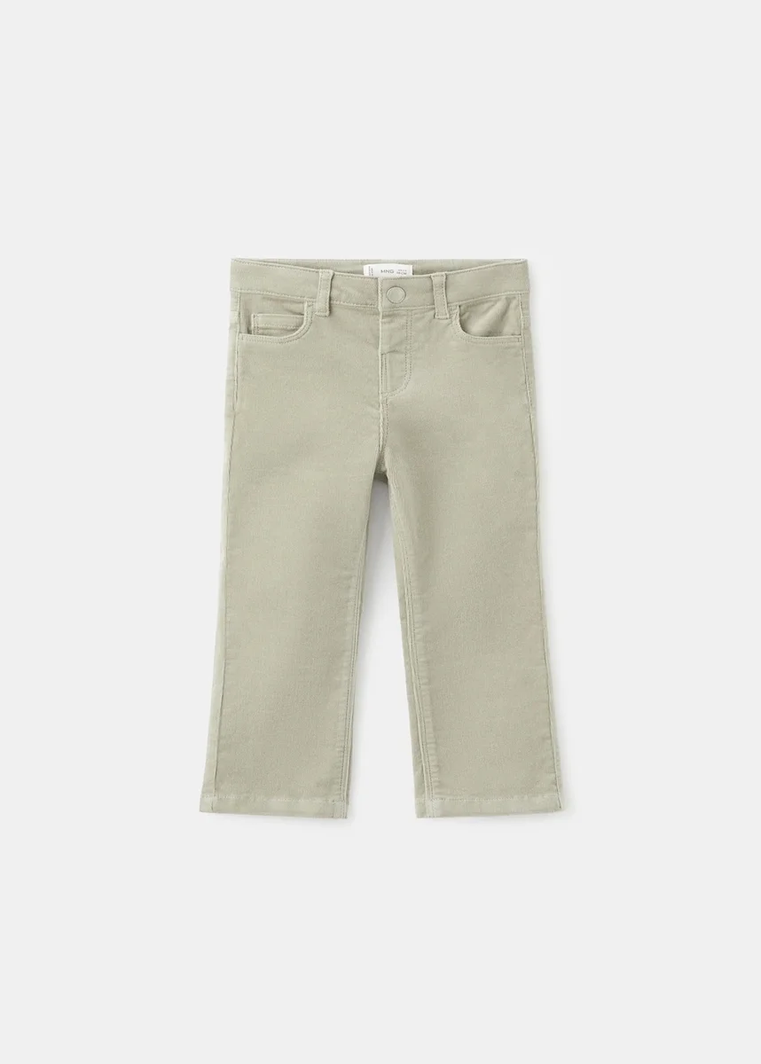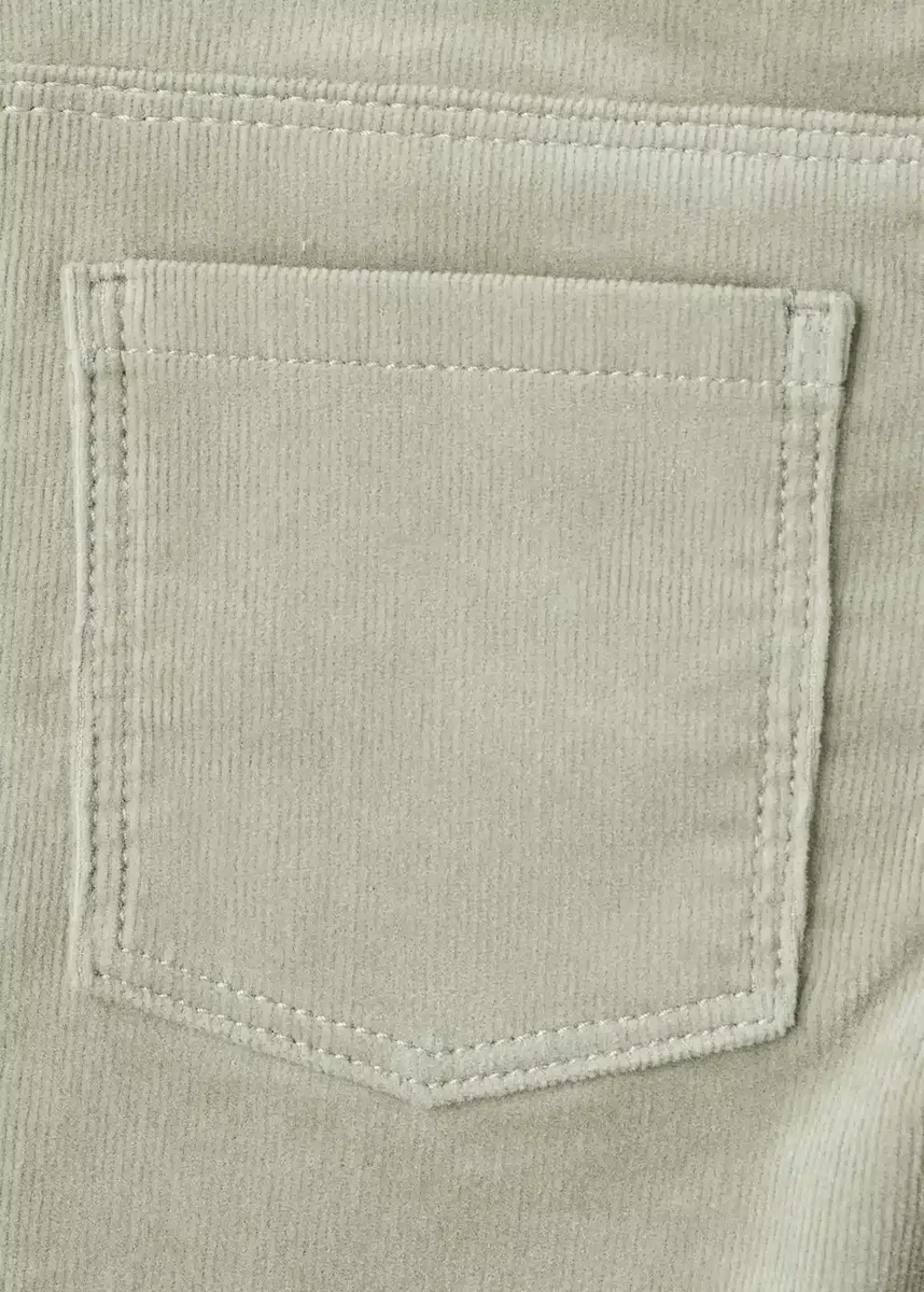 Směs bavlny. Manšestrová tkanina. Zvonový střih. Dlouhý střih. Poutka na opasek. Pět kapes. Jedno zapínání na druk.