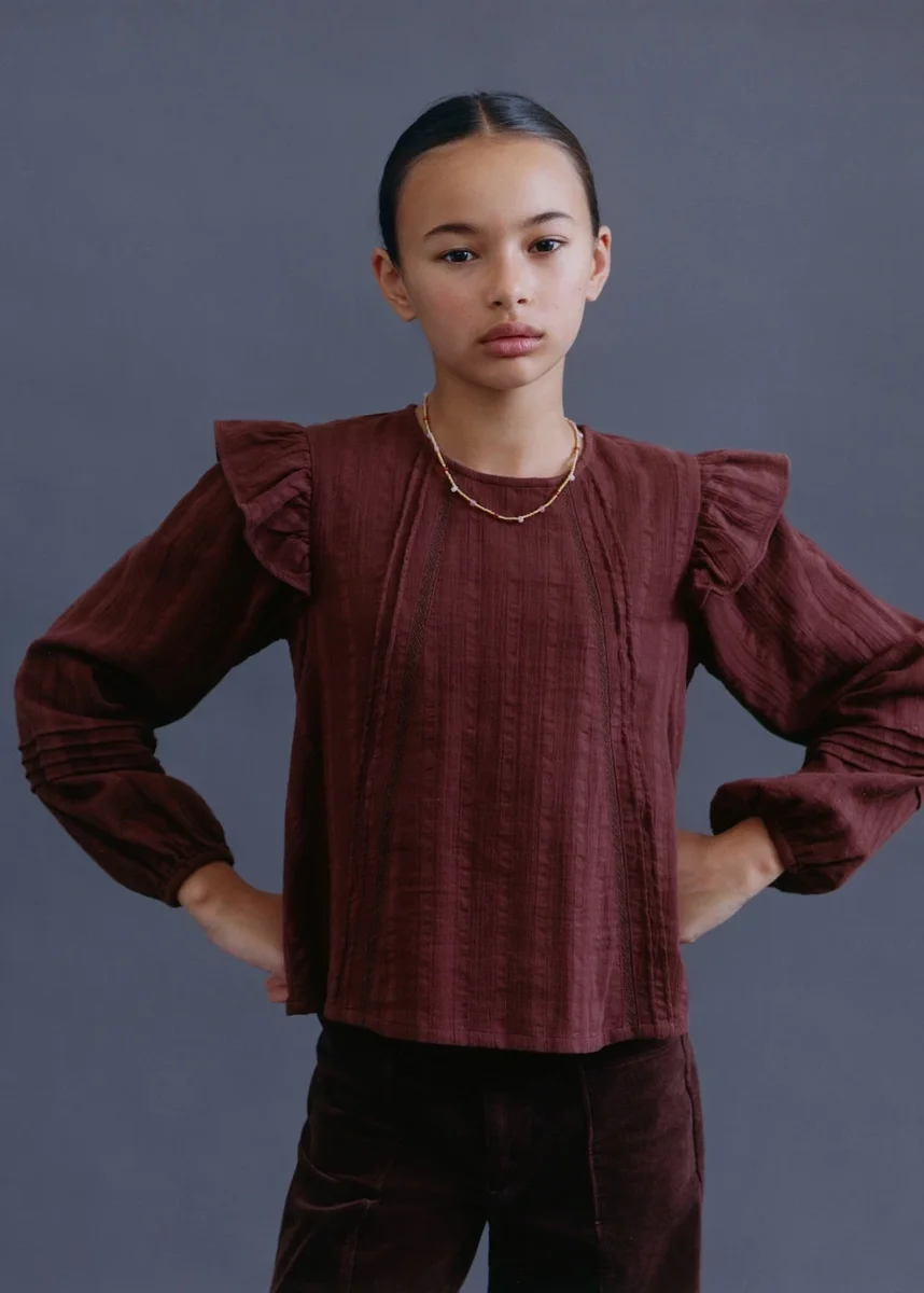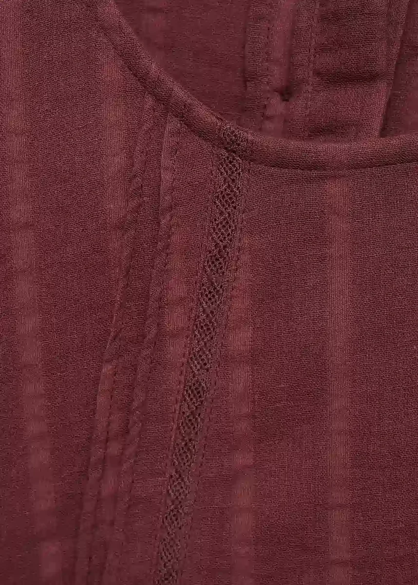 100% bavlna. Texturovaná. Kulatý výstřih. Dlouhé rukávy s elastickými manžetami. Zapínání na knoflíky. Řasené detaily.