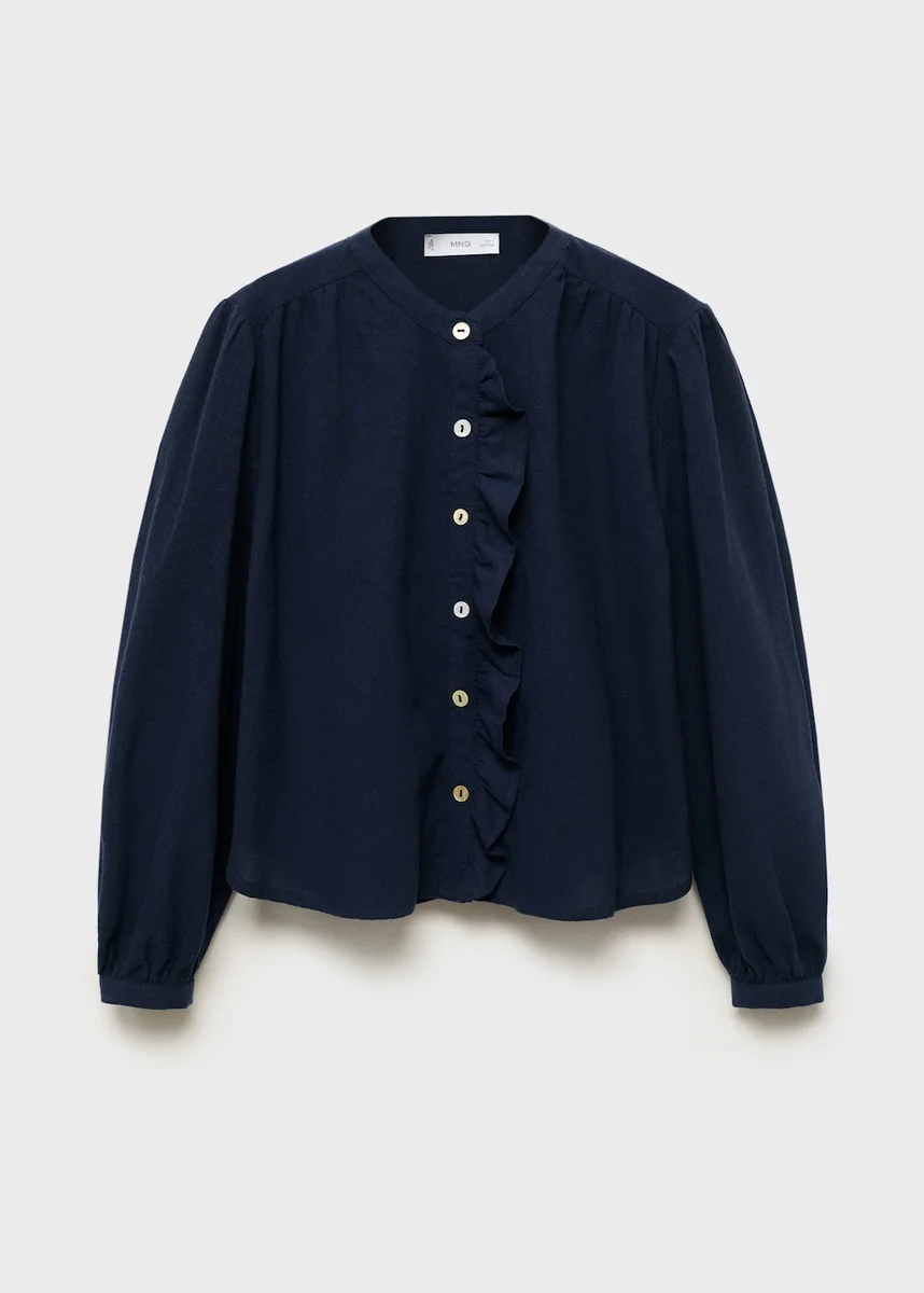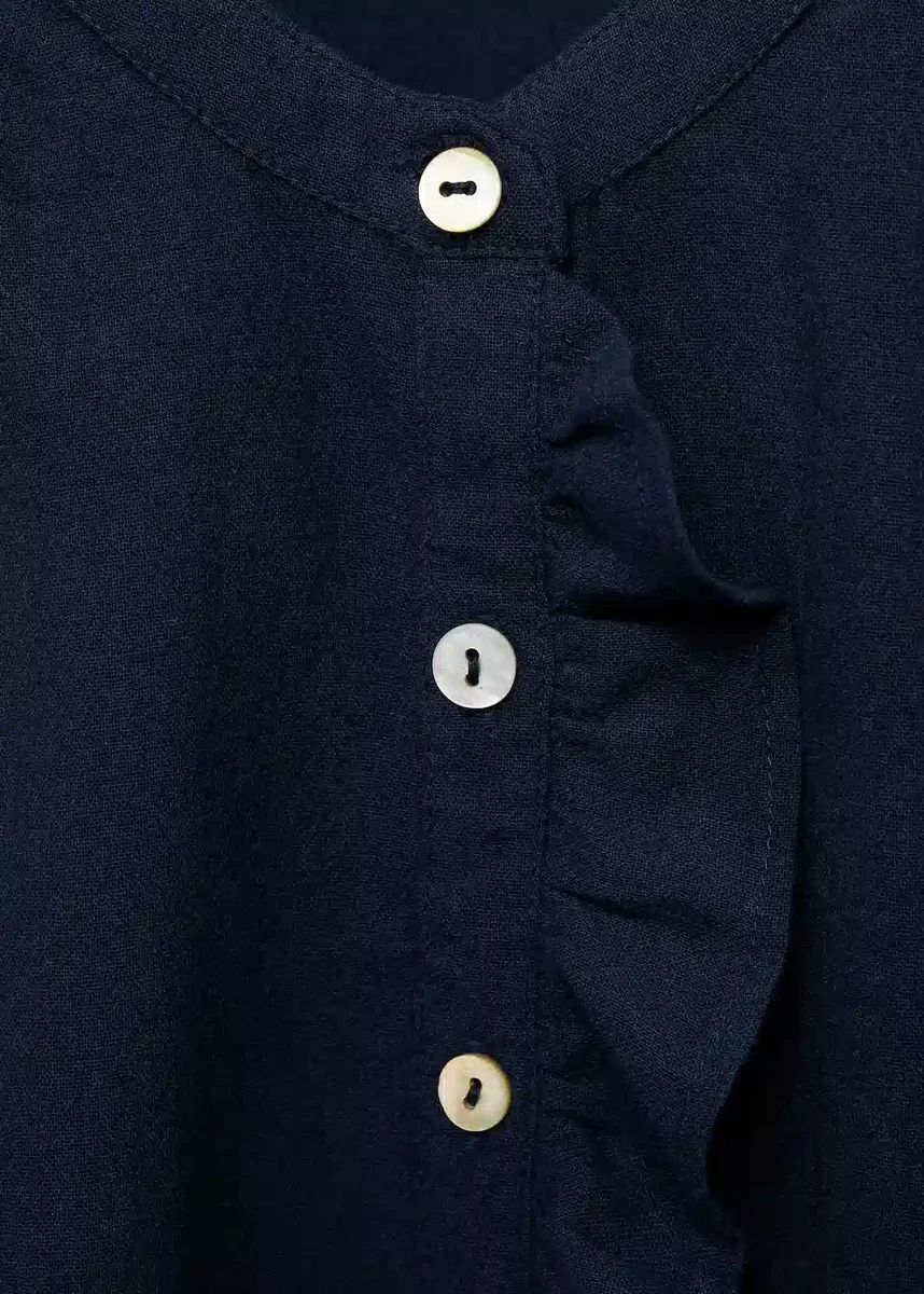 Tento model je vyroben ze 100% bavlny a má rovný střih s kulatým výstřihem. Dlouhé rukávy mají manžety na knoflíky a zapínání na knoflíky vpředu je doplněno ozdobným volánkem.