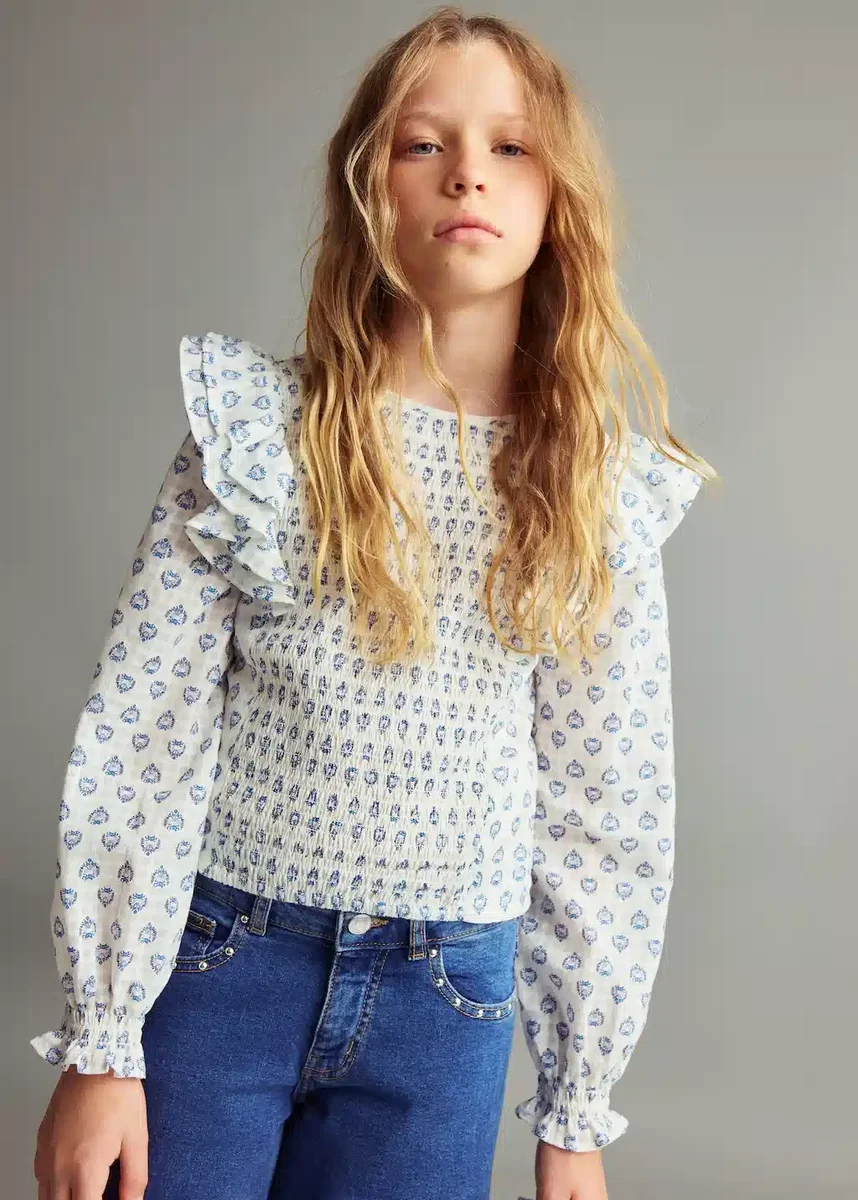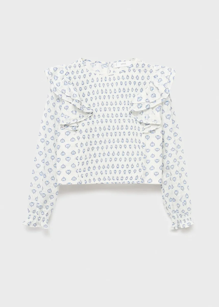 Tato halenka je vyrobena ze 100% bavlny a má rovný střih s potiskem. Kulatý výstřih doplňují volánky na dlouhých rukávech, které mají elastické a řasené manžety. Má zapínání na zádech a řasené detaily vpředu.