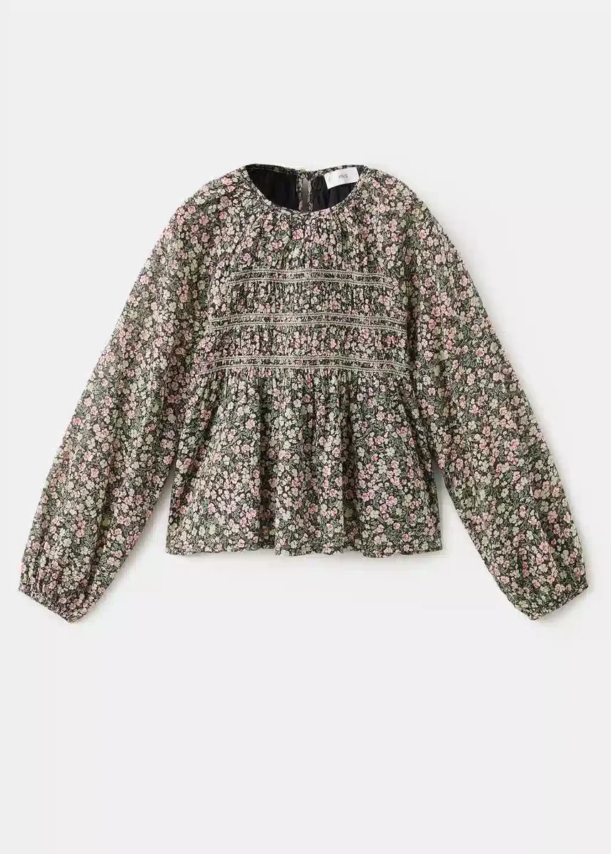 100 % bavlna. Rovný střih. Květinový potisk. Kulatý výstřih. Dlouhé rukávy s elastickými manžetami. Nařasené detaily. Vyšívané detaily. Zapínání na knoflíky u krku