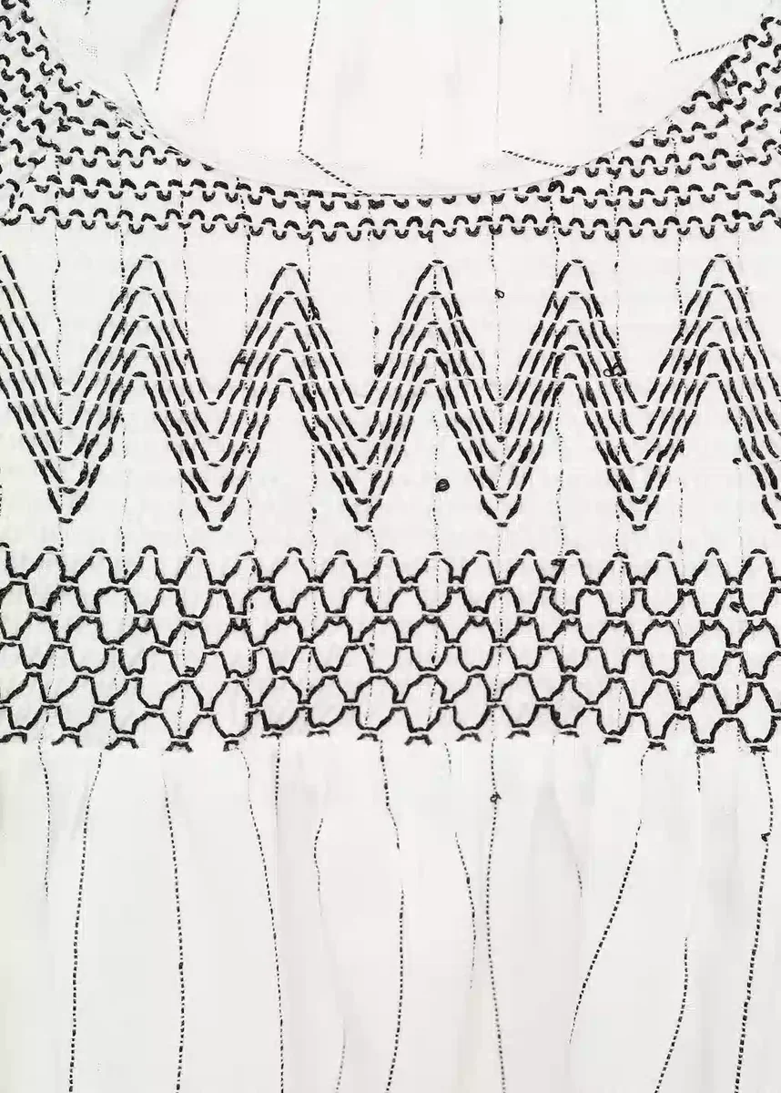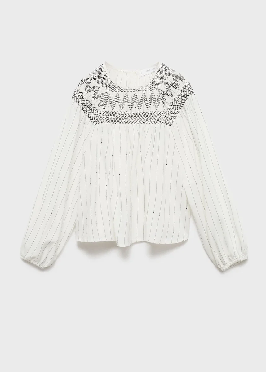 Vyšívané detaily. Kulatý výstřih. Dlouhé rukávy
