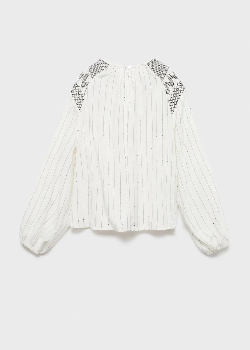 Vyšívané detaily. Kulatý výstřih. Dlouhé rukávy.
