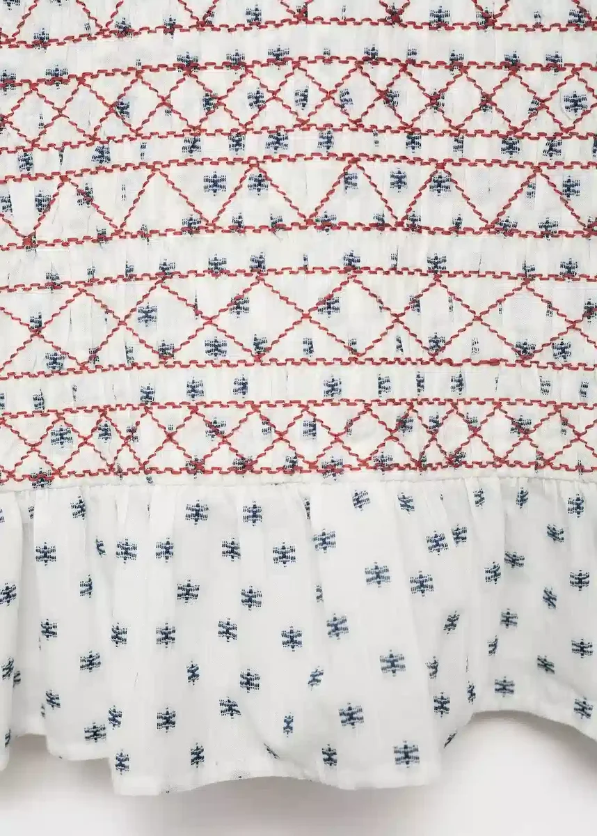 Bavlněná tkanina. Potisk. Vyšívané detaily. Kulatý výstřih. Dlouhé rukávy s elastickými manžetami. Zapínání na knoflíky vzadu. Volán na spodním lemu. S vnitřní podšívkou. Černý pátek