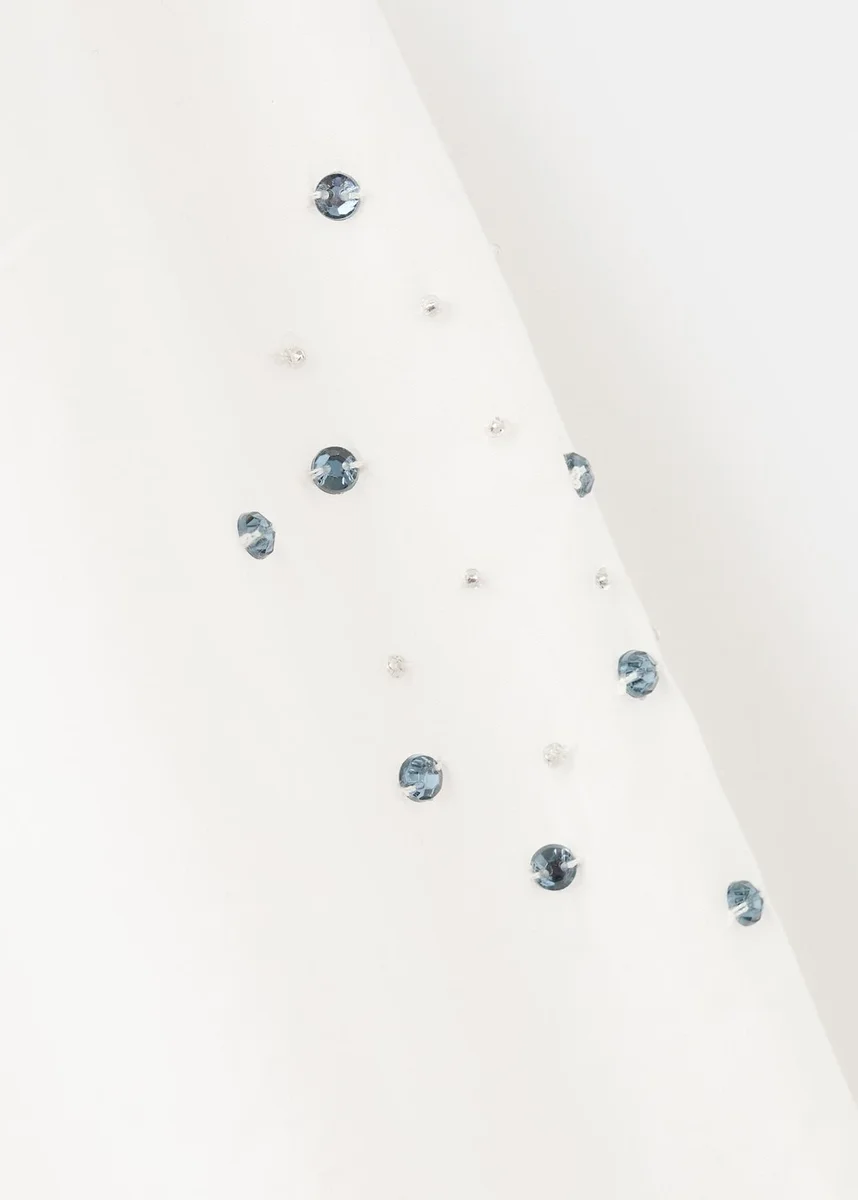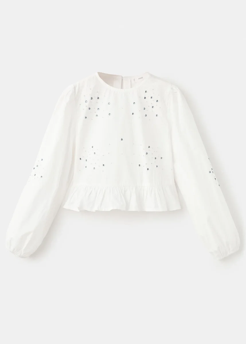 100% bavlna. Vyšívaný vzor. Lesklý design. Výšivka z mikrokuliček. Kulatý výstřih se zapínáním na knoflíky. Dlouhé nafouklé rukávy. Elastické manžety. Volán na spodním lemu.