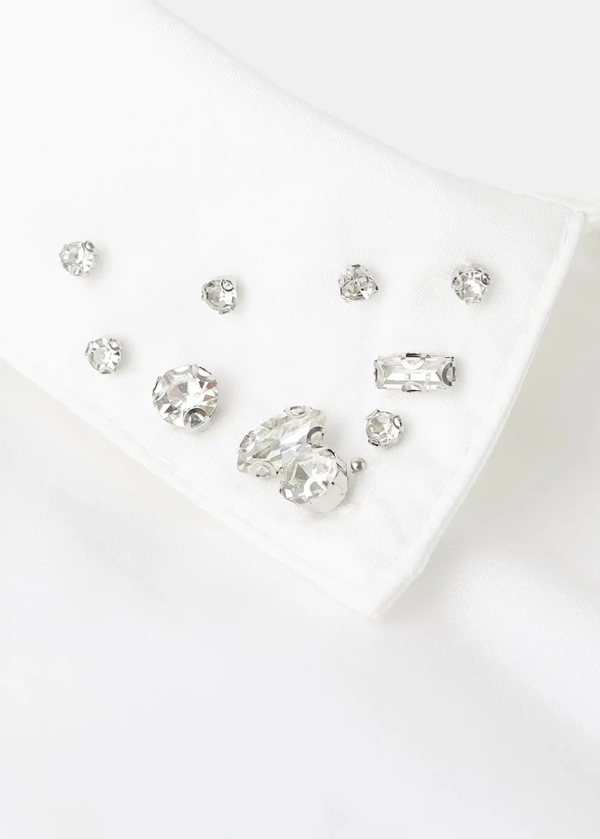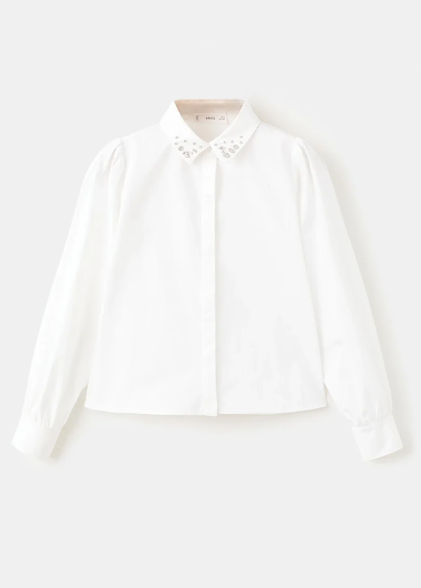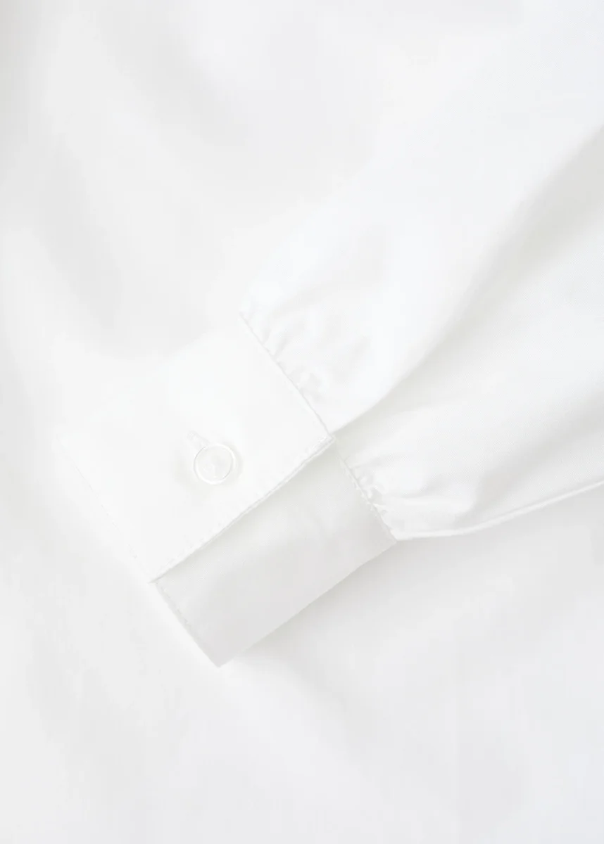 Tento oděv je vyroben ze 100% bavlny a má rovný střih s límečkem zdobeným korálky. Dlouhé řasené rukávy a manžety na knoflíky doplňují přední zapínání na knoflíky.