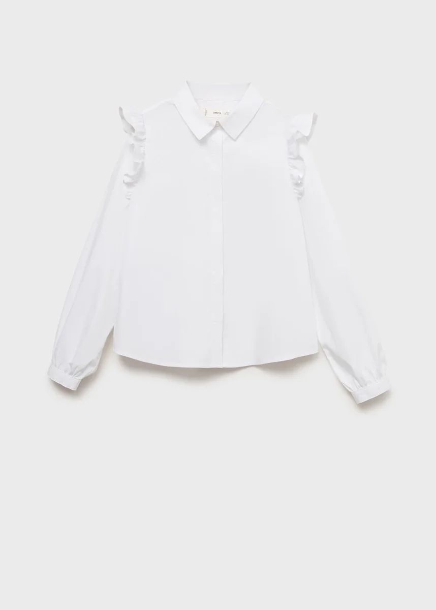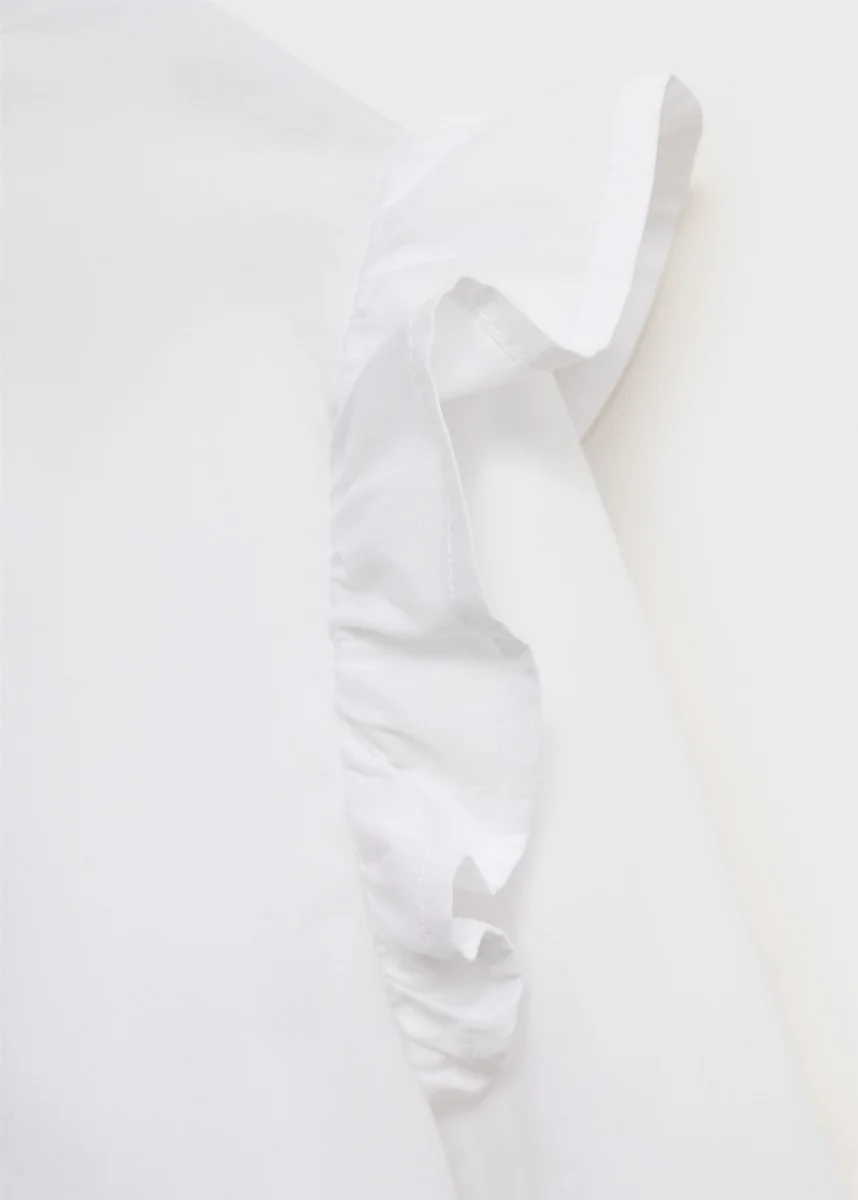100% bavlna. Jednobarevný design. Dlouhý střih. Košilový límec. Dlouhé rukávy. Ruchované detaily na manžetách. Volánky na ramenou. Skryté zapínání na knoflíky vpředu.
