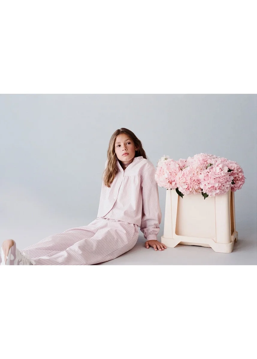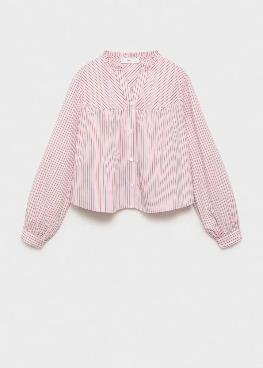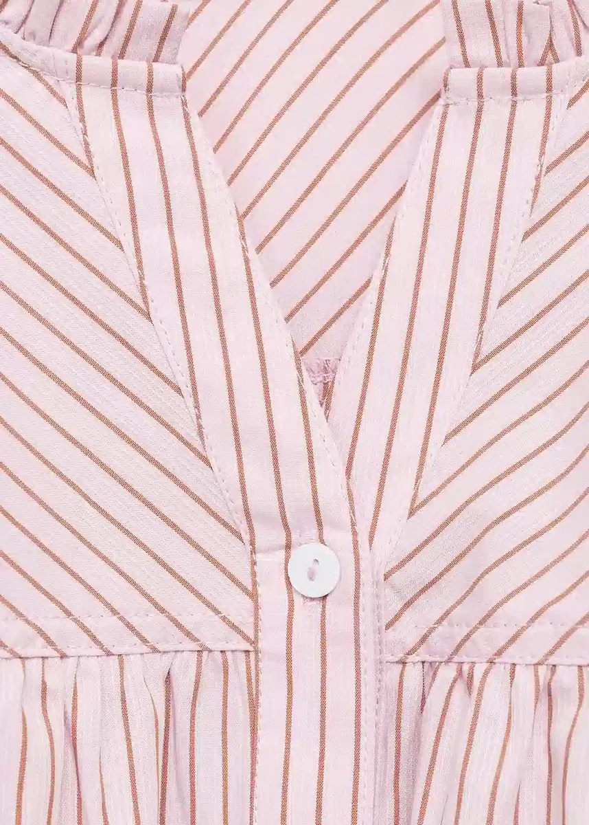 Tento oděv je vyroben ze 100% bavlněné látky s pruhy a má střih do A a výstřih do V. Dlouhé rukávy mají zapínání na knoflíky a řasené manžety, stejně jako detail na hrudi. Přední zapínání na knoflíky dotváří celkový vzhled.