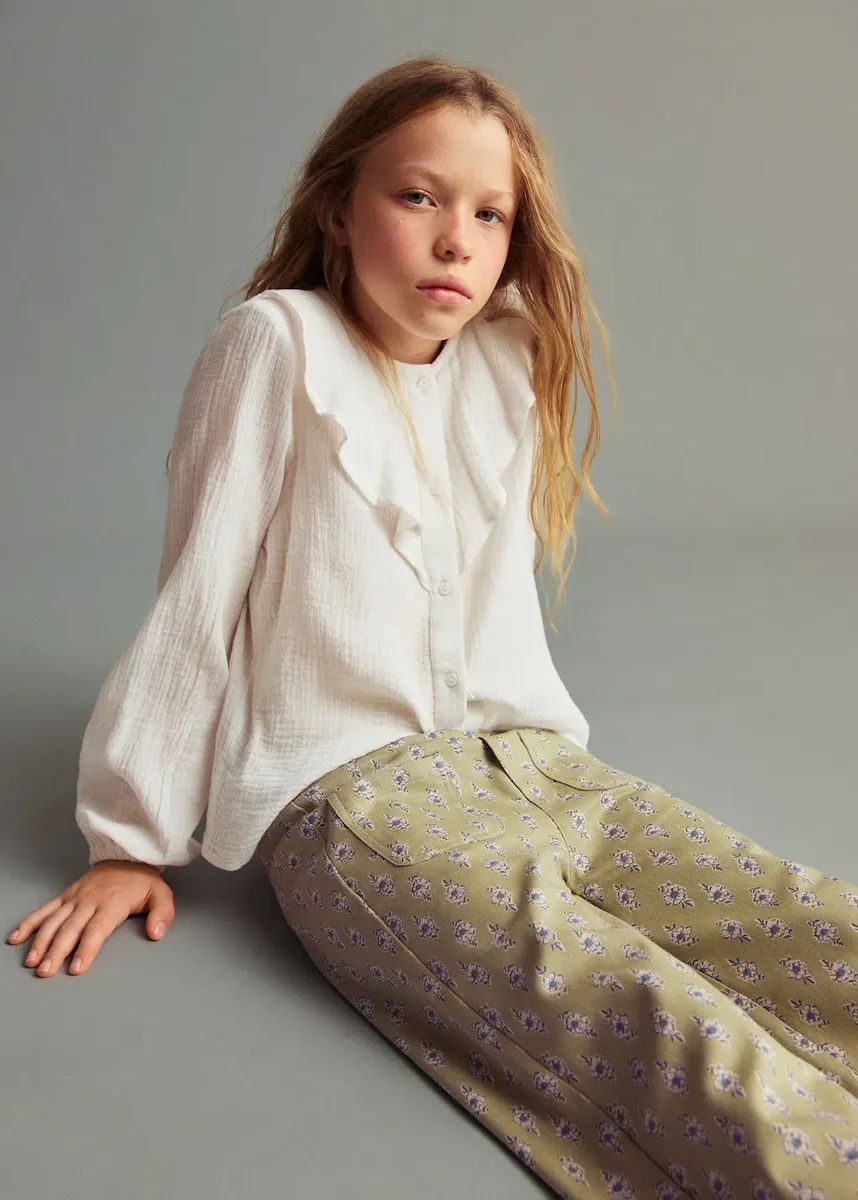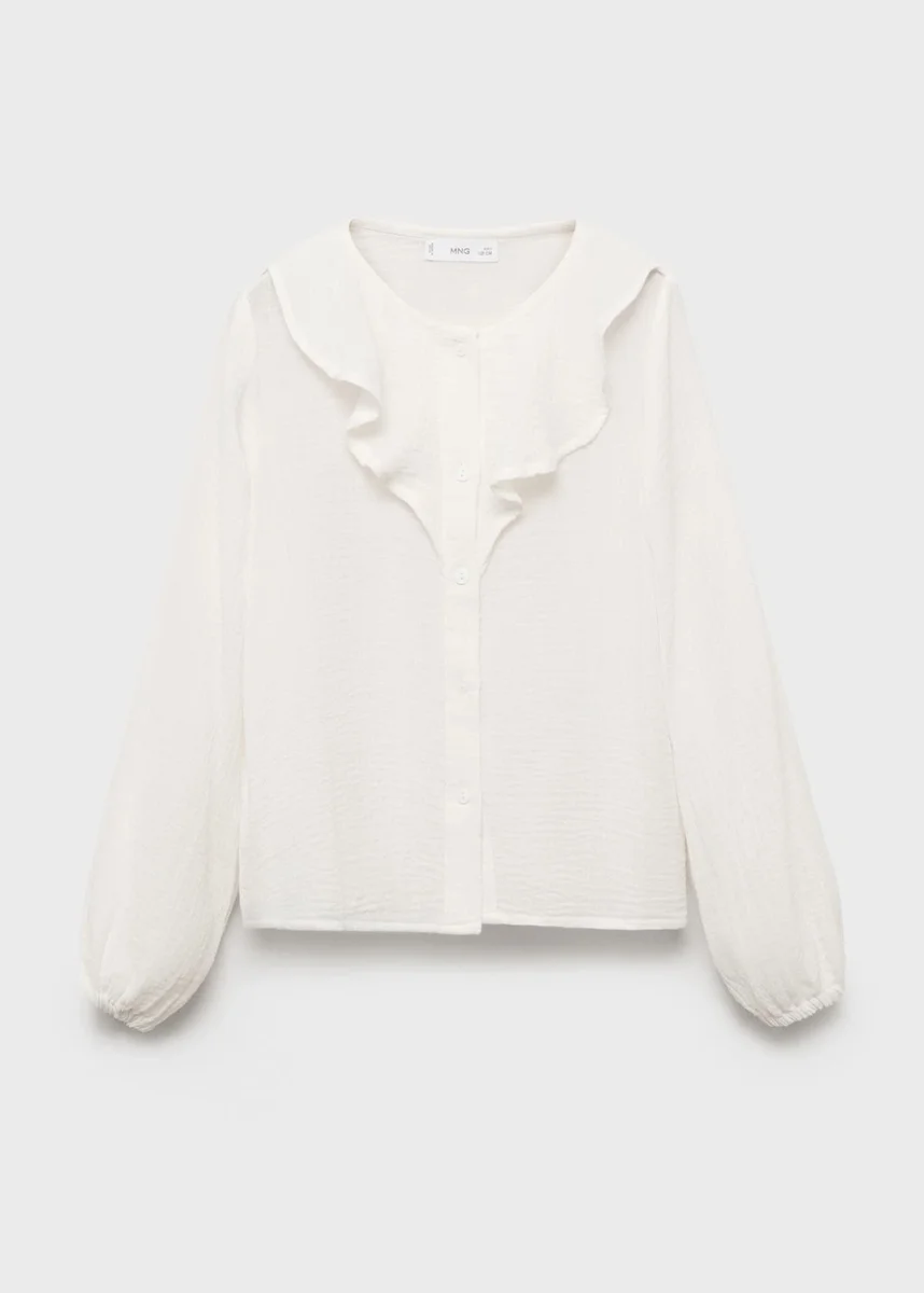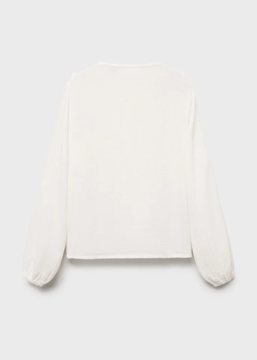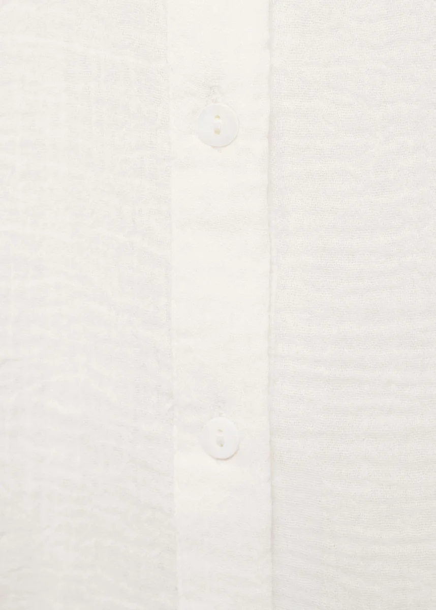 Tento oděv je vyroben ze 100% bavlněné tkaniny typu cheesecloth a má rovný střih s volánkovými detaily. Má kulatý výstřih a zapínání na knoflíky vpředu. Dlouhé rukávy mají manžety na knoflíky.