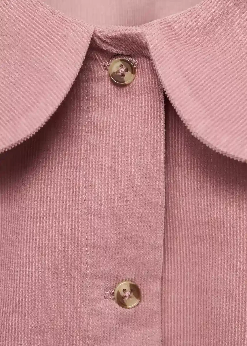 100 % bavlna. Manšestr. Rovný střih. Límec Peter Pan. Dlouhé rukávy s žebrovanými lemy. Zapínání na knoflíky vpředu. Black Friday