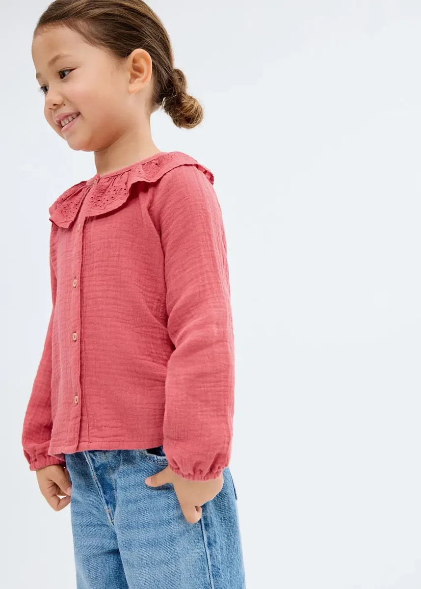 100% bavlna. Bambulová tkanina. Rovný střih. Kulatý výstřih. Babydoll límec. Dlouhé rukávy s elastickými manžetami. Zapínání na knoflíky vpředu.