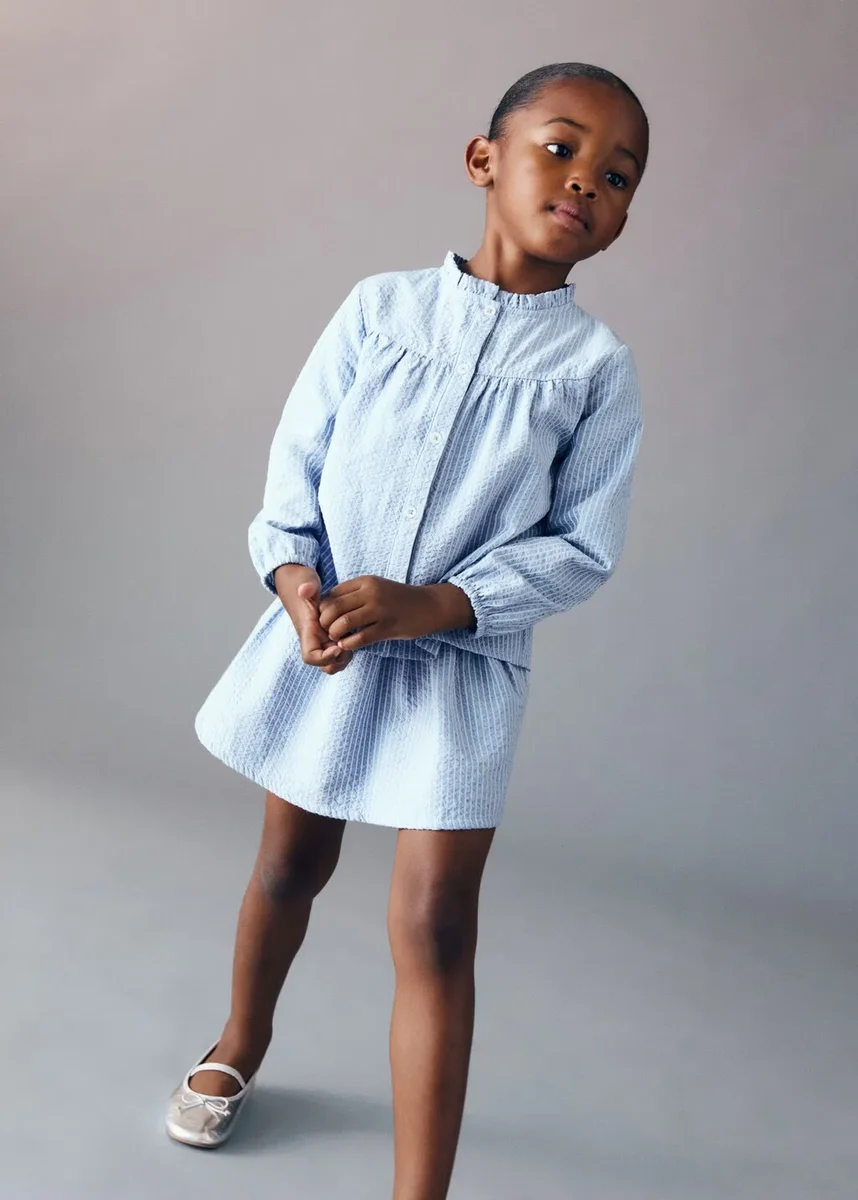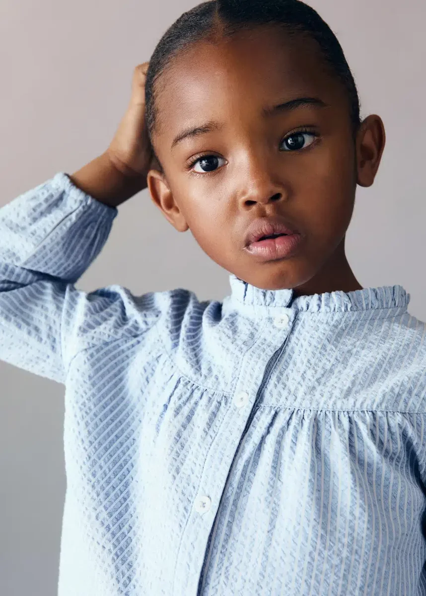 Tato halenka je ušita z pruhované bavlněné látky a má střih do A. Nařasený kulatý výstřih a dlouhé rukávy s elastickými manžetami dodávají stylu, zatímco zapínání na knoflíky vpředu a nařasené detaily na hrudi dotvářejí její design.