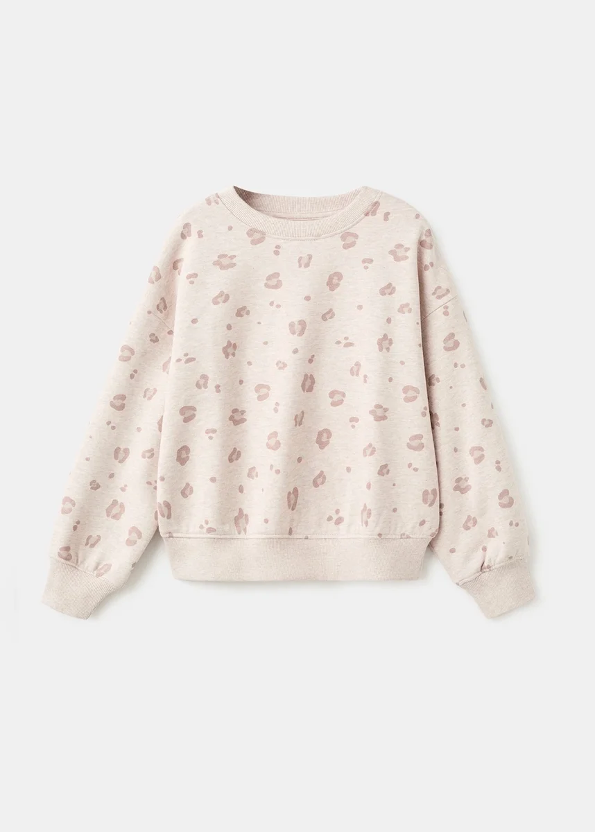 100% bavlna. Tkanina s zvířecím potiskem. Leopardi potisk. Rovný střih. Kulatý výstřih. Dlouhé rukávy. Žebrovaný výstřih, manžety a lem.