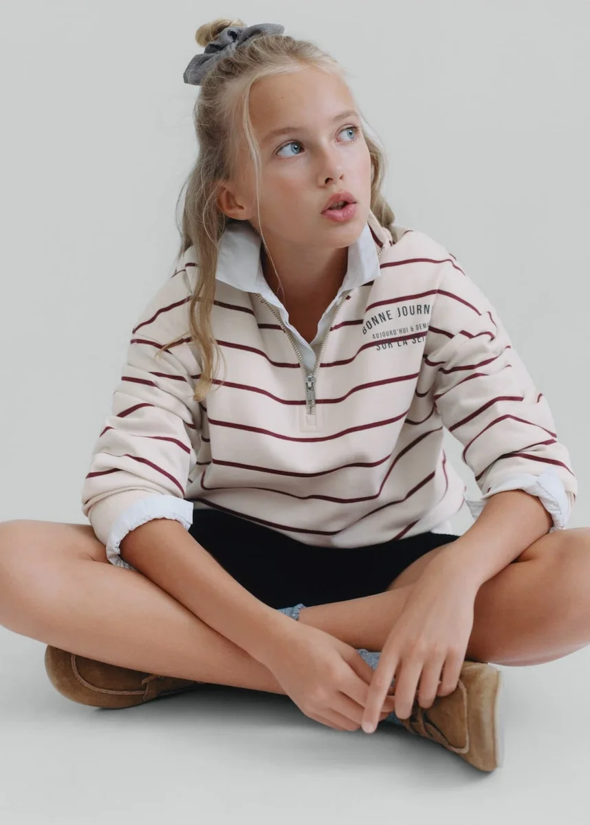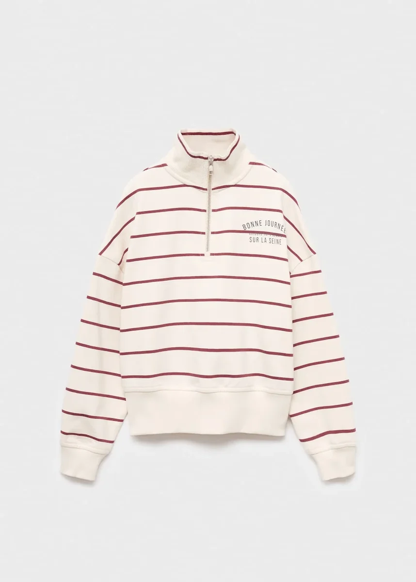 Bavlněná tkanina. Pruhovaný design. Potisk. Text vyražený na přední a zadní straně. Rolákový výstřih se zipem. Dlouhé rukávy.