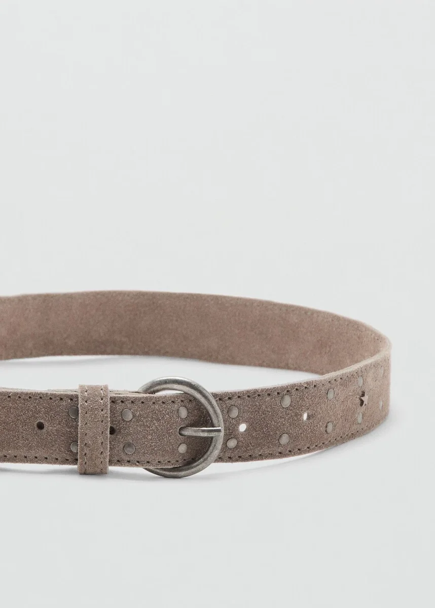 100 % hovězí kůže. Semiš. Jedna smyčka. Kulatá spona. Cvočky.