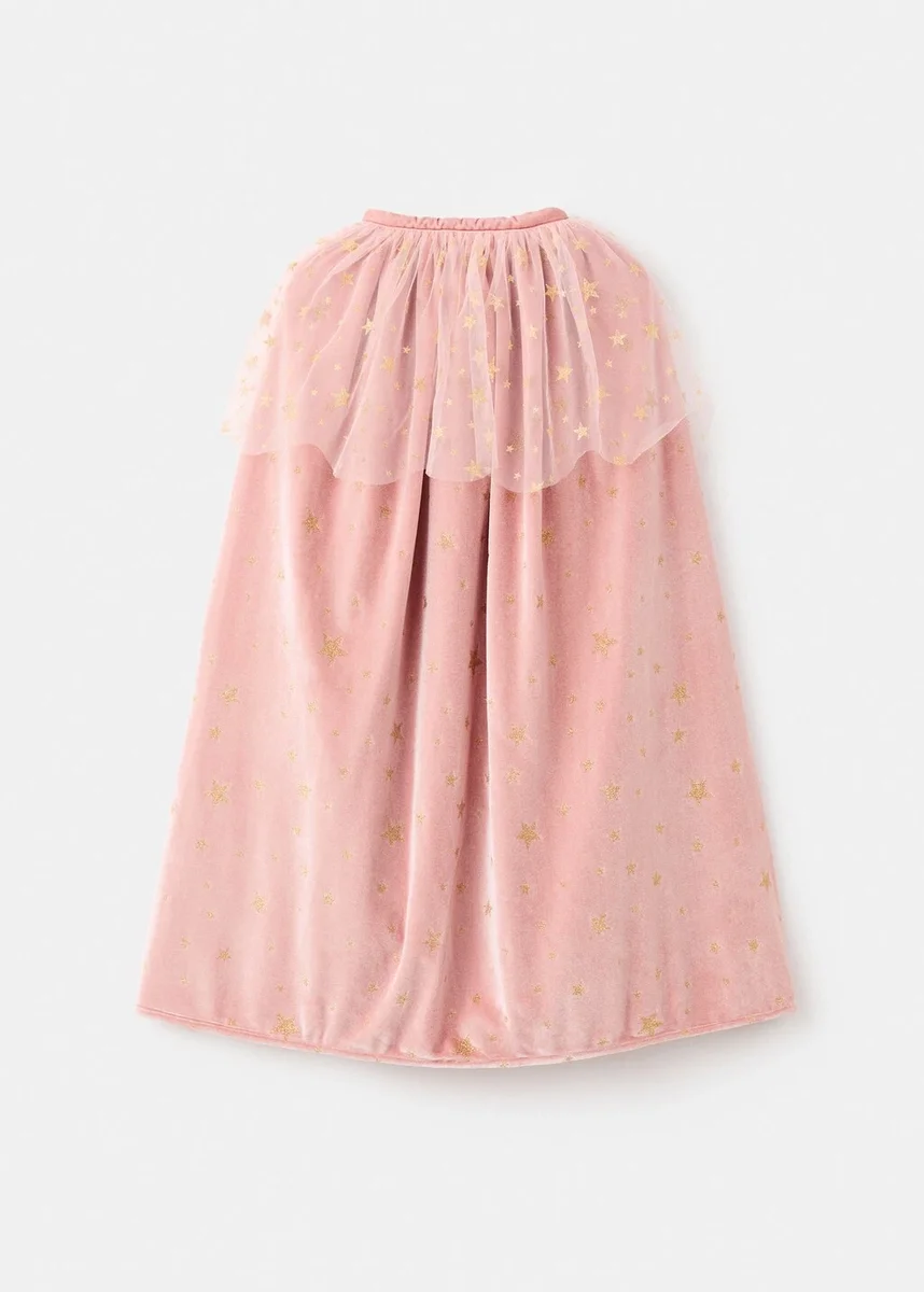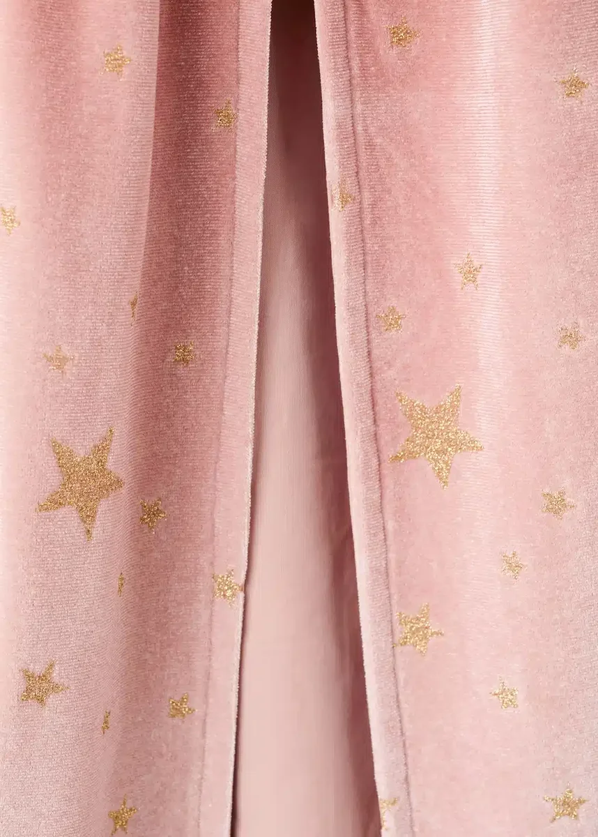 Sametová tkanina. Vrstvený design. Potisk s třpytivými hvězdami. Tylové detaily. Zapínání na suchý zip. Vnitřní podšívka. Sladěná sukně. Halloweenová kolekce.