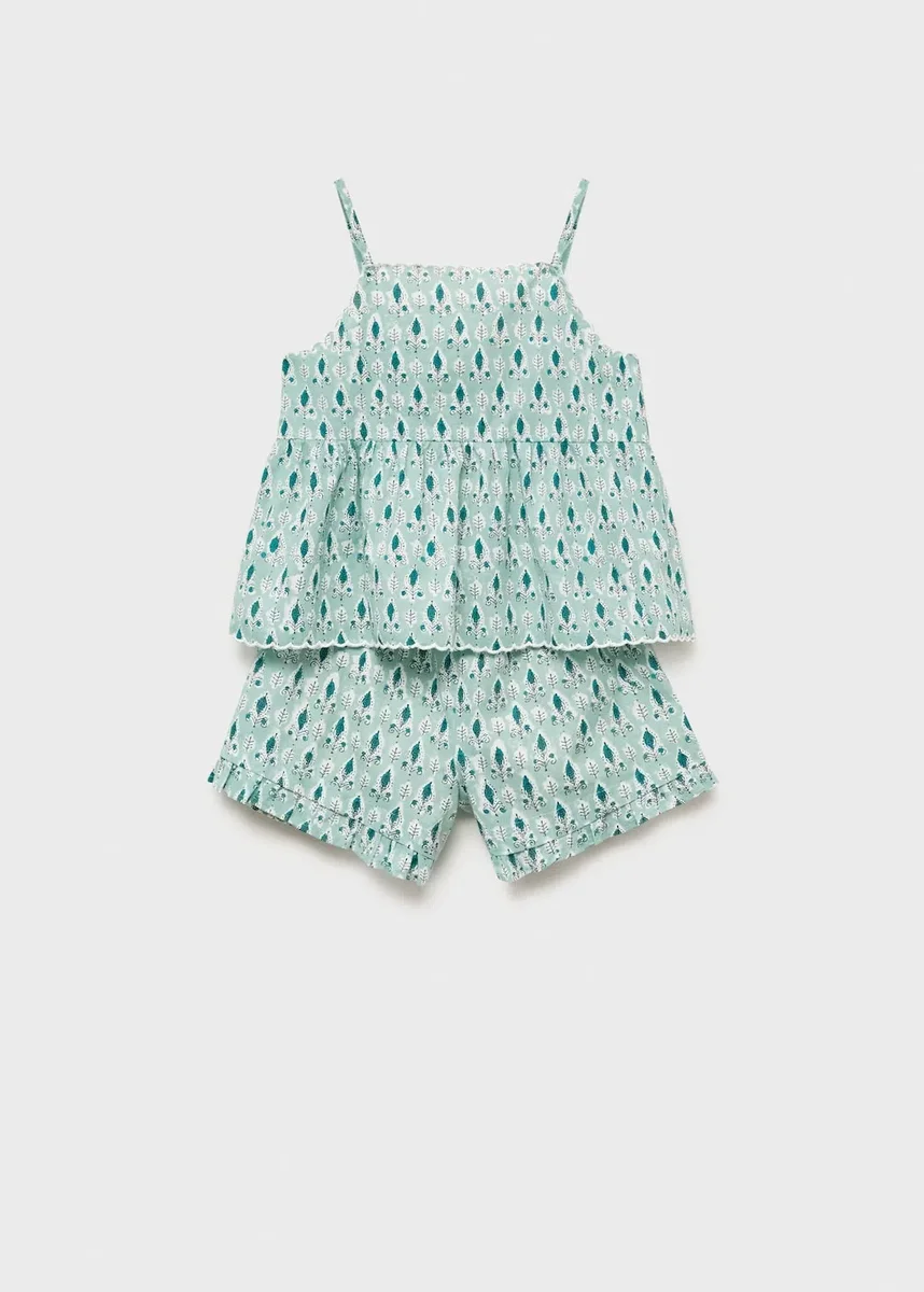Sada trička a pyžamových kalhot. 100% bavlna. Krátký střih. Rovný střih. Potisk. Rovný výstřih. Bez rukávů. Tenká ramínka. Bez zapínání. Elastický pas. Vyšívané detaily. Volánový lem.