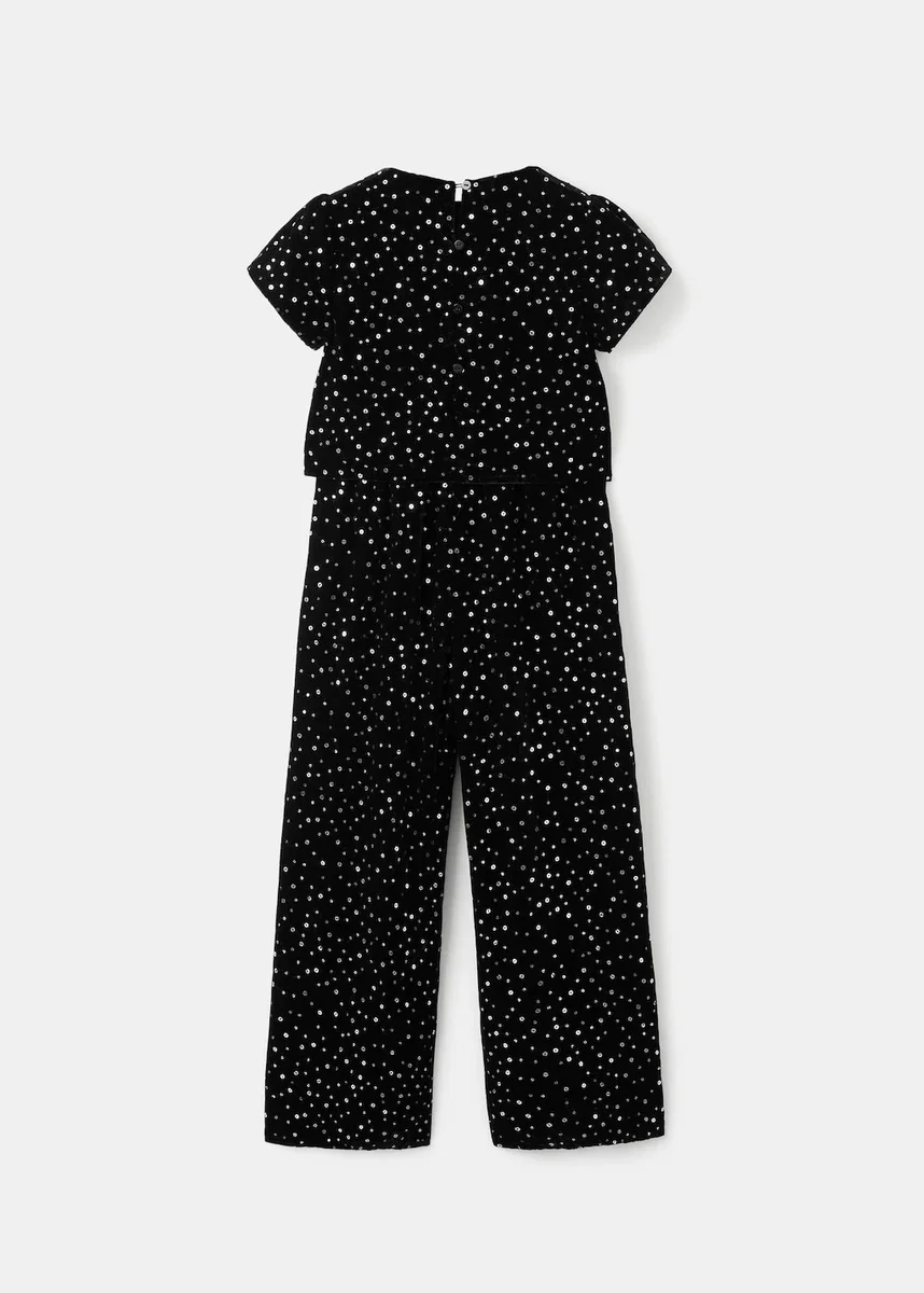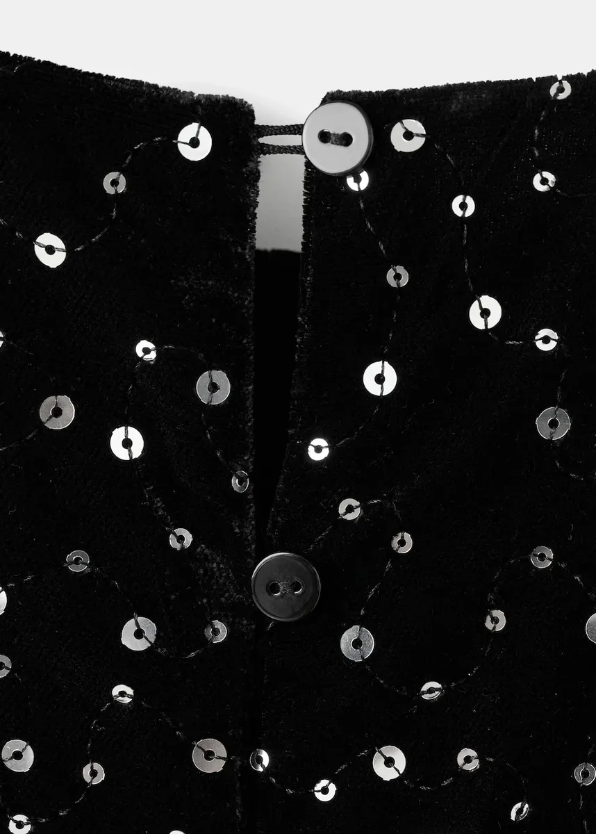 Dlouhý střih. Tkanina s flitry. Kulatý výstřih. Krátké rukávy. Rovný střih. Zapínání na knoflíky. Kolekce pro večírky.