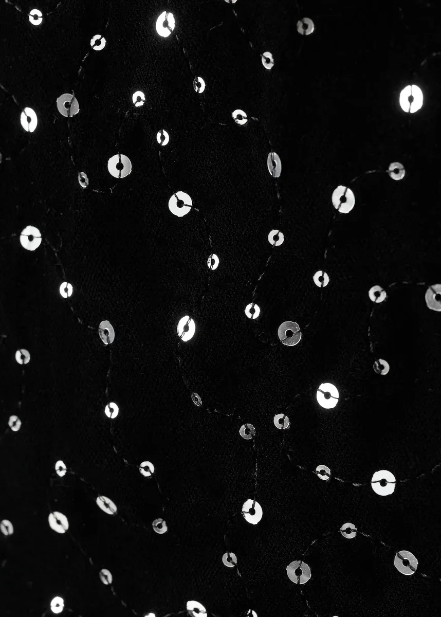 Dlouhý střih. Tkanina s flitry. Kulatý výstřih. Krátké rukávy. Rovný střih. Zapínání na knoflíky. Kolekce pro večírky