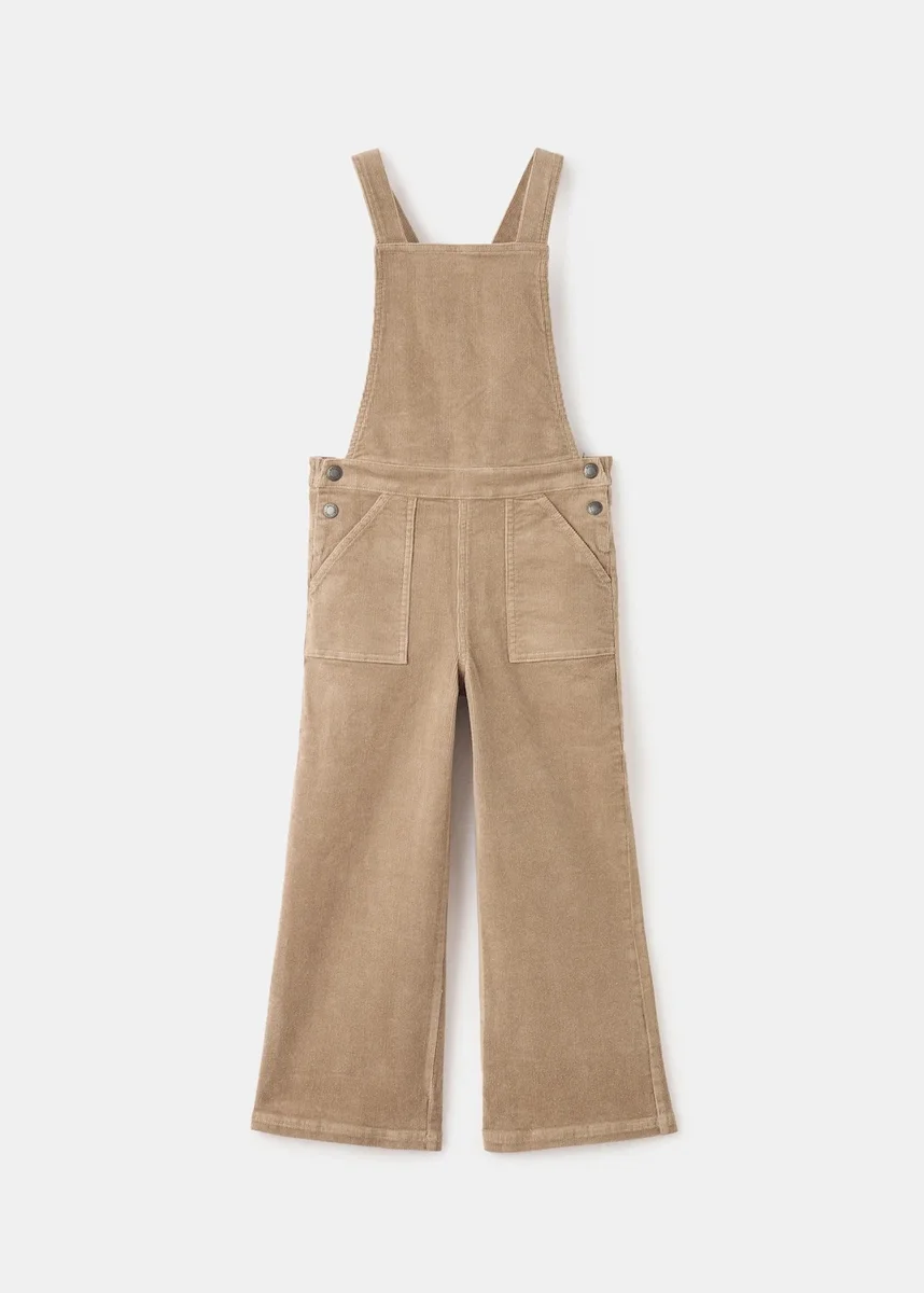 Bavlněná tkanina. Manšestrová tkanina. Dlouhý střih. Rovný výstřih. Křížené ramínka na zádech. Ramínka se zapínáním na knoflíky. Boční zapínání na knoflíky. Dvě boční kapsy. Dvě našité kapsy na zádech.