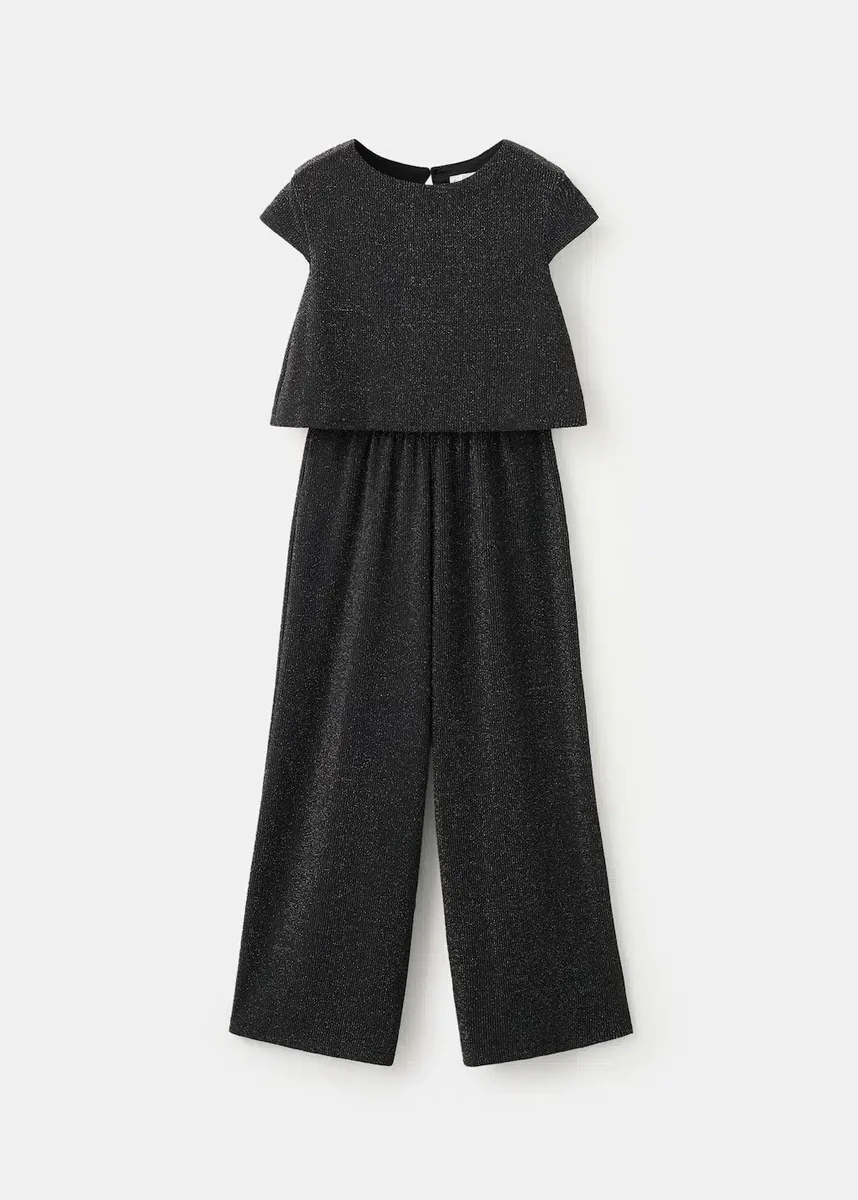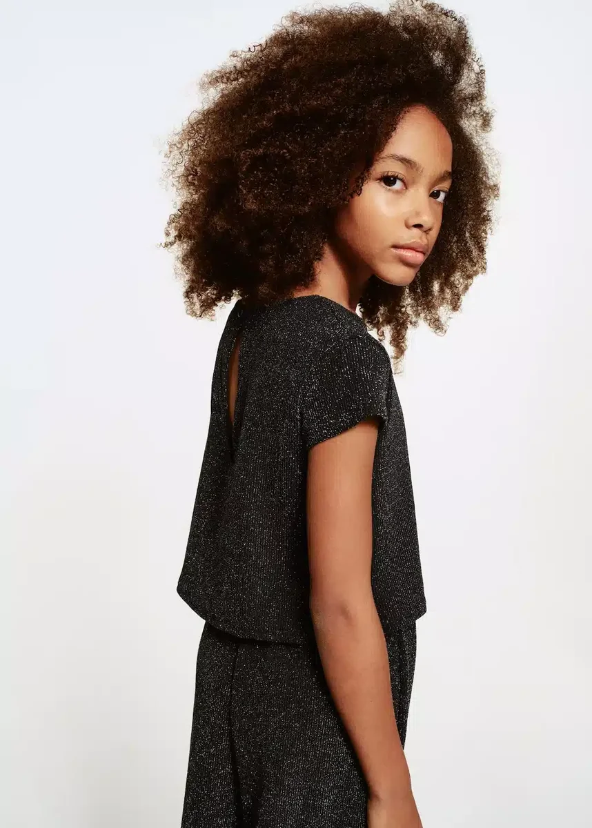 Pružný materiál. Lurexová tkanina. Dlouhý střih. Kulatý výstřih se zapínáním na knoflíky. Krátké rukávy. Shromážděný pas. Kolekce pro večírky. Černý pátek.