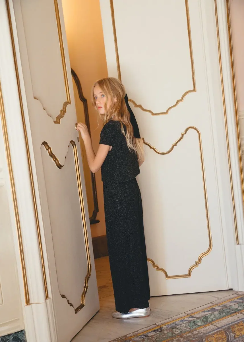Plynulá tkanina. Lurexová tkanina. Dlouhý střih. Kulatý výstřih se zapínáním na knoflíky. Krátké rukávy. Nařasený pas. Kolekce Party. Black Friday