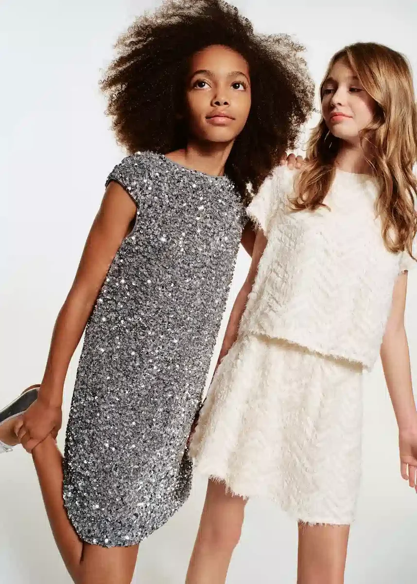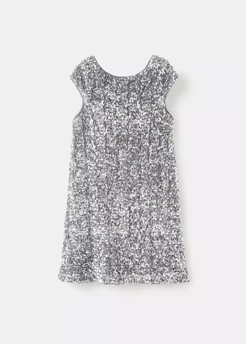 Tkanina s flitry. Rovný střih. Krátký střih. Kulatý výstřih. Krátké rukávy. Vnitřní podšívka. Bez zapínání. Kolekce pro večírky.
