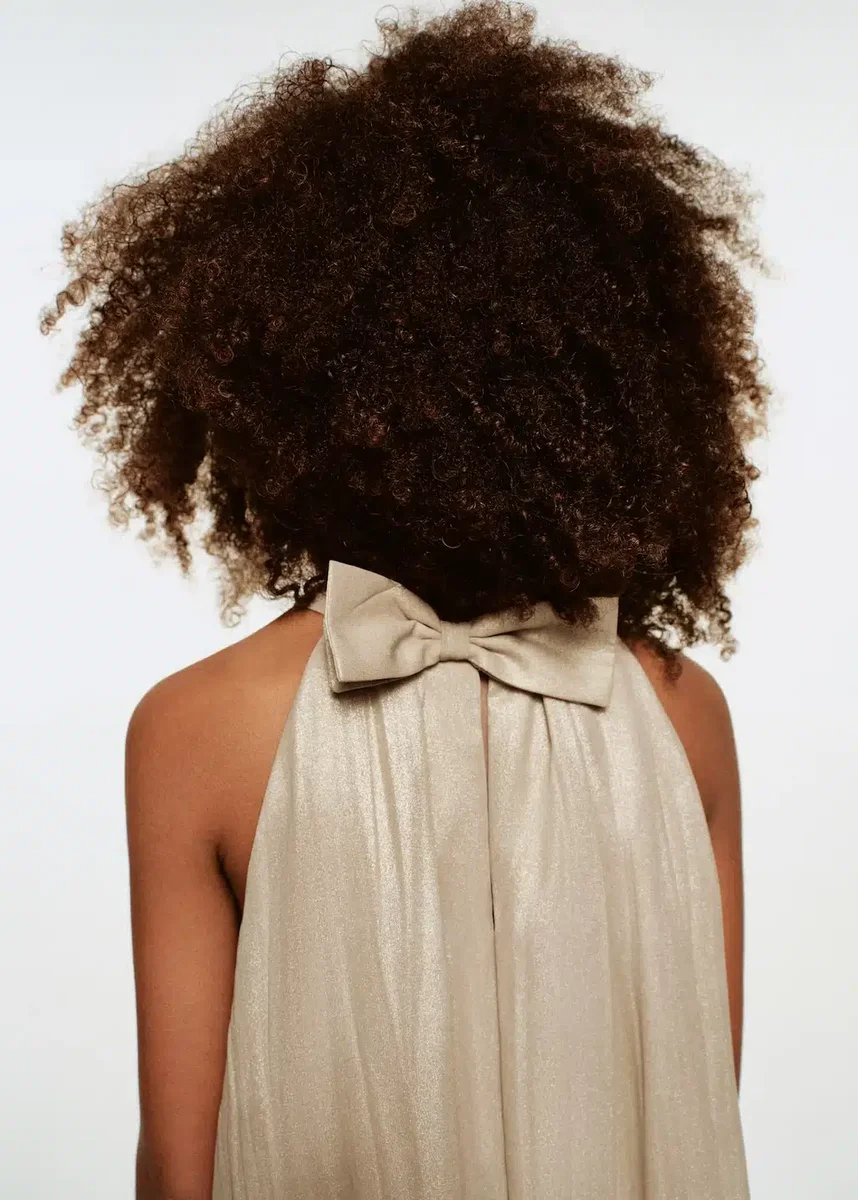 Metalická tkanina. Krátký střih. Kulatý výstřih. Bez rukávů. Mašle. Kolekce pro večírky.