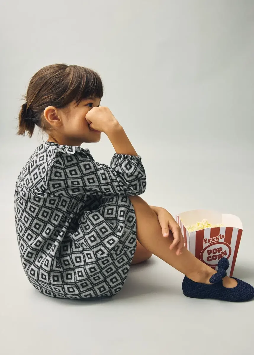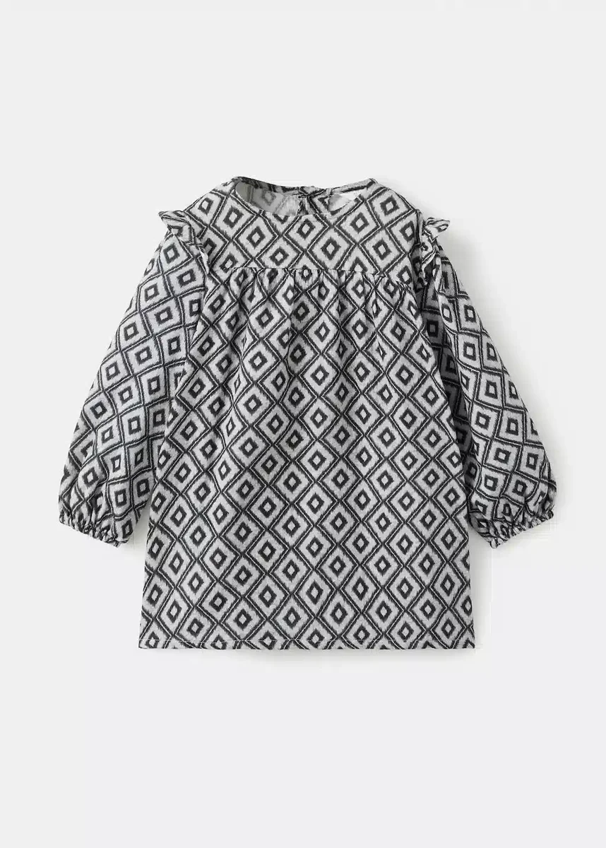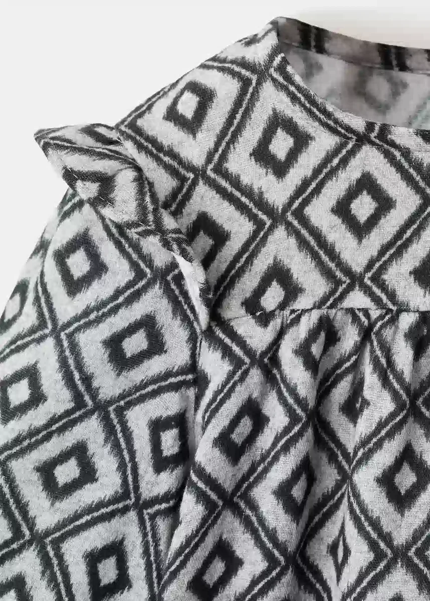 100 % bavlna. Střih do A. Potisk. Etnický potisk. Kulatý výstřih. Volánky na ramenou. Zapínání na knoflíky na zadní straně. Dlouhé rukávy s elastickými manžetami. Nařasený detail na hrudi.