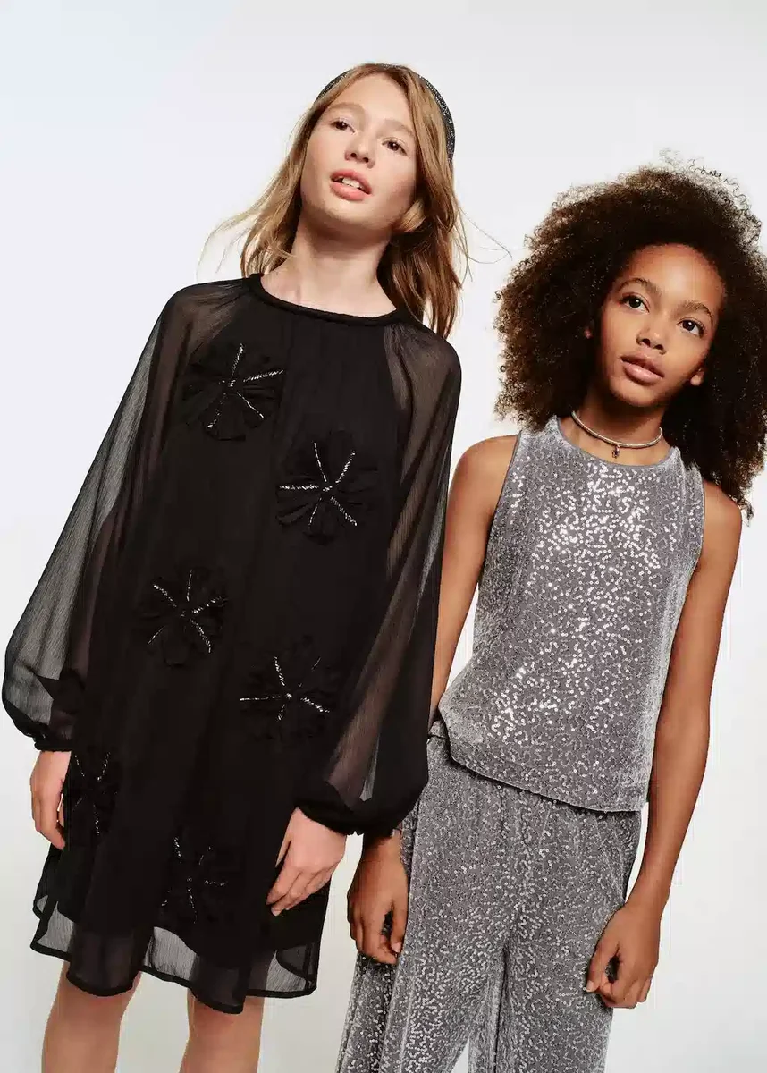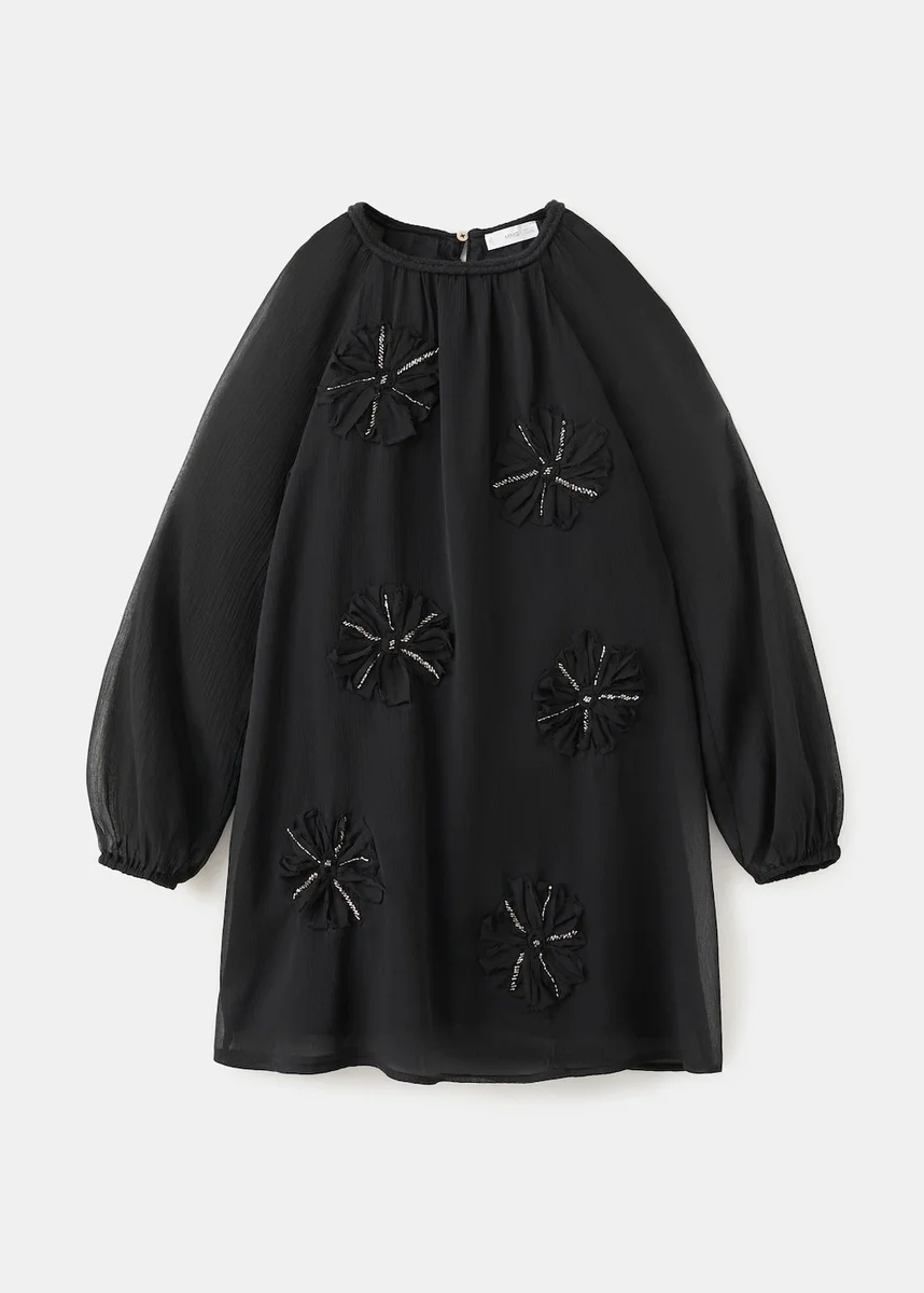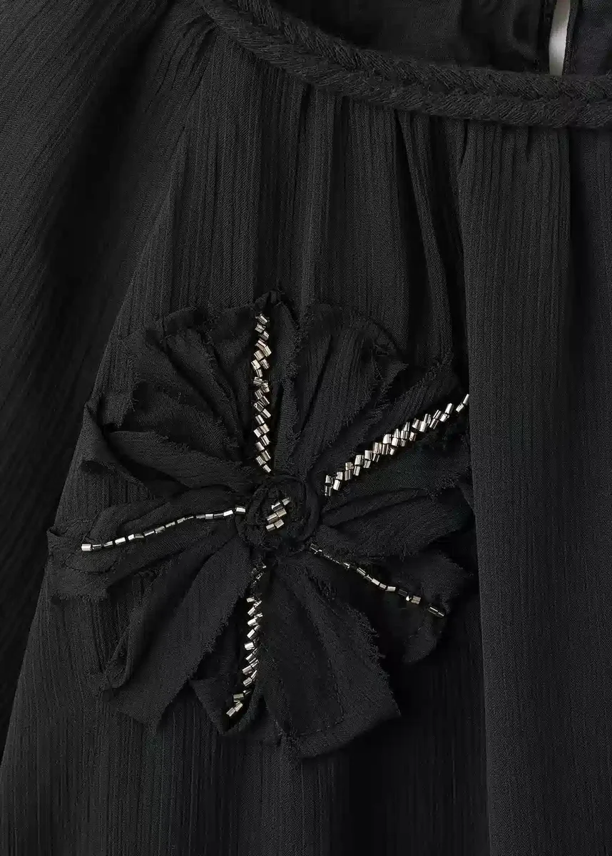 Pružný materiál. Vyšívaný vzor. Květinová výšivka. Výšivka z mikrokuliček. Kulatý výstřih se zapínáním na knoflíky. Poloprůsvitné rukávy. Dlouhé nafouklé rukávy. Rukávy se shrnuty. S vnitřní podšívkou. Kolekce pro večírky. Vánoční kolekce. Černý pátek.