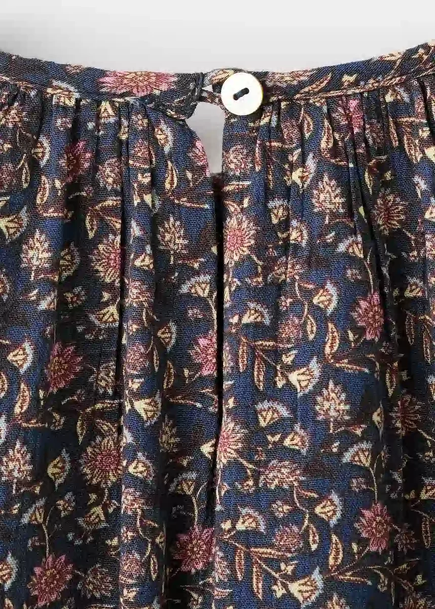 Květinový potisk. Kulatý výstřih. Dlouhé rukávy. Volánky. Krátký střih. Zapínání na knoflíky.