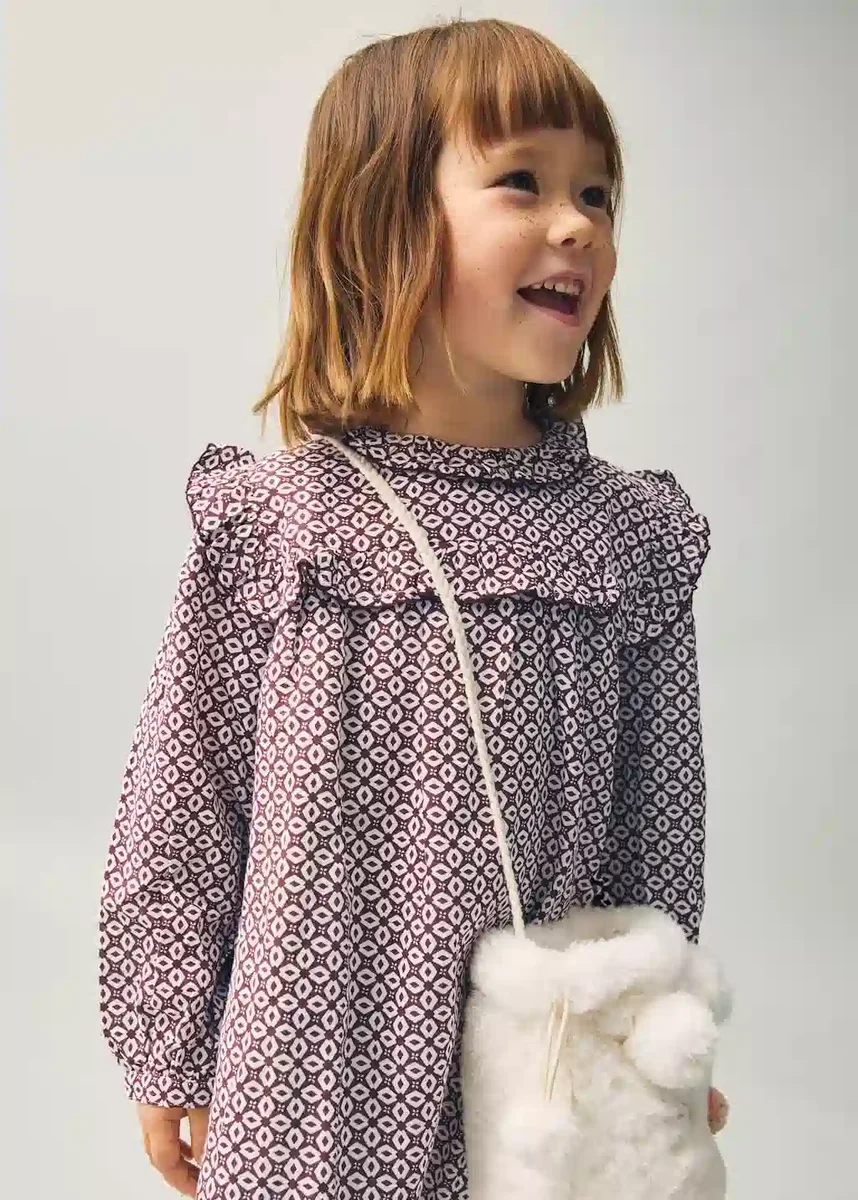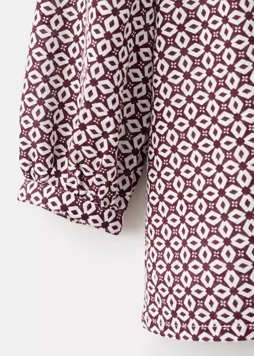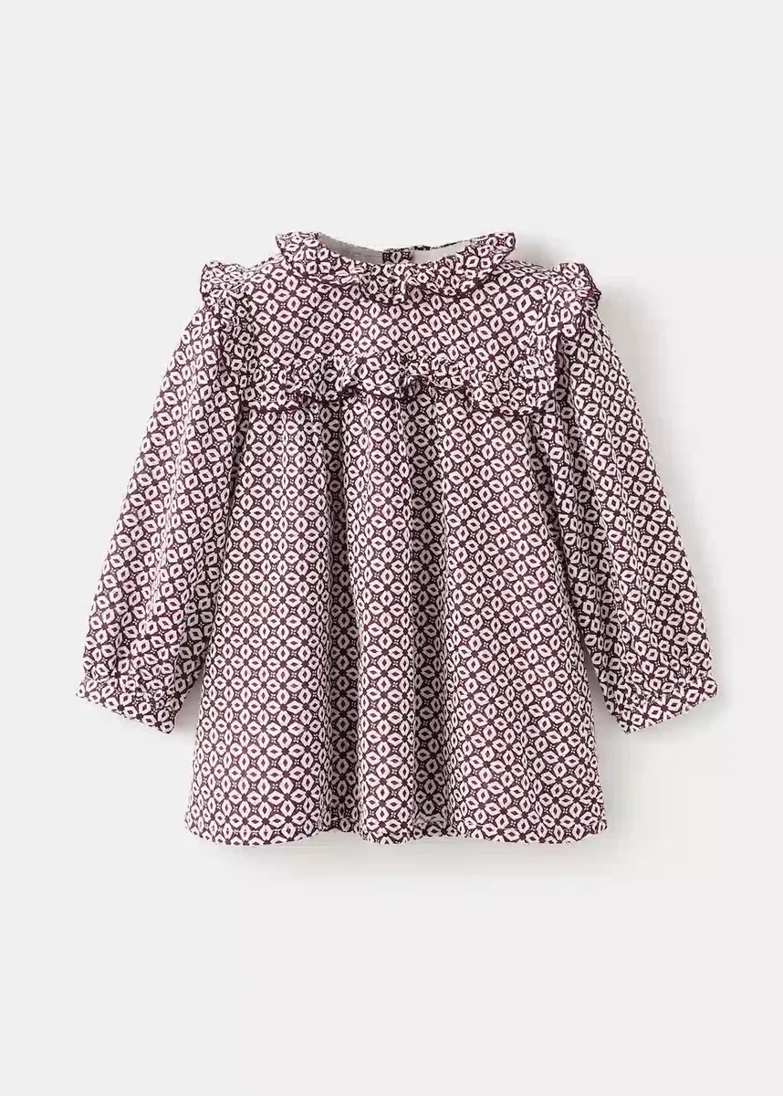 100% bavlna. Střih do A. Volánkový kulatý výstřih. Volány na ramenou. Dlouhé rukávy. Zapínání na knoflíky na zadní straně. Black Friday.
