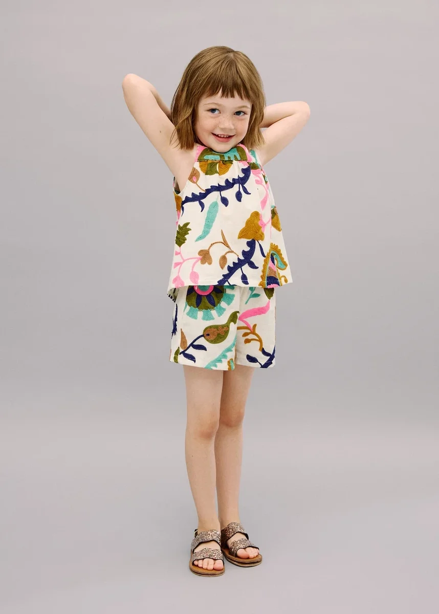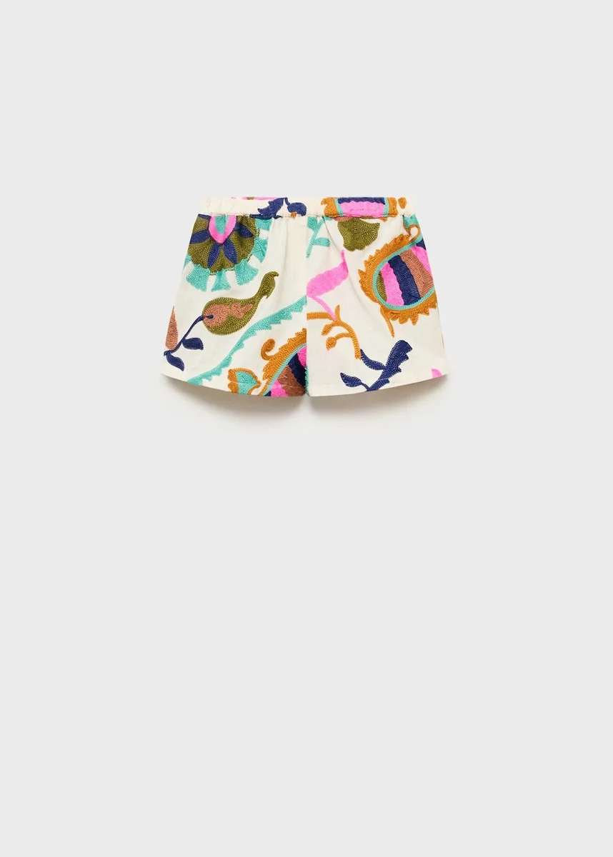 Bavlněná tkanina. Lněná tkanina. Vyšívaný vzor. Vícebarevný vzor. Rovný střih. Elastický pas. Bez zapínání. Celkový vzhled