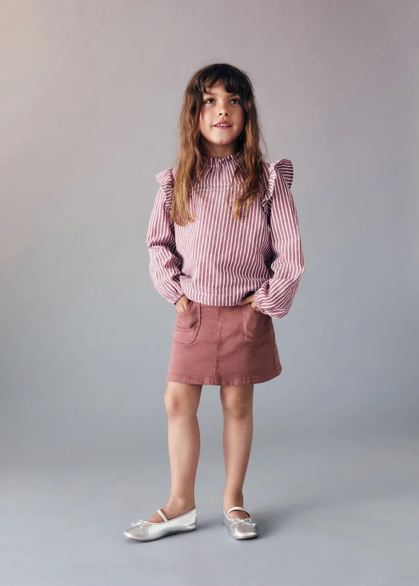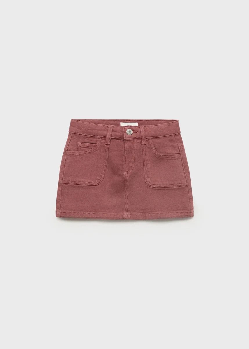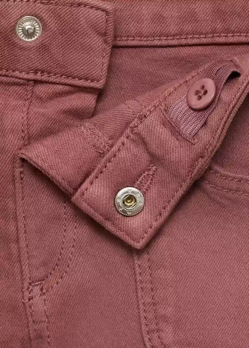 Tento oděv je vyroben z bavlněné látky v denimovém stylu a má krátký a rovný střih. Má poutka na opasek, pět kapes a zapínání na patentky pro pohodlné a funkční nošení.