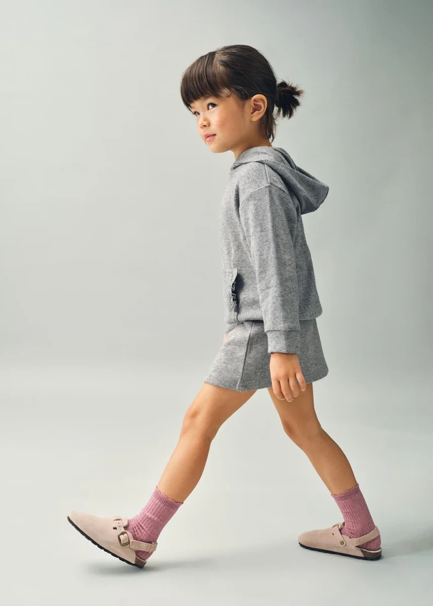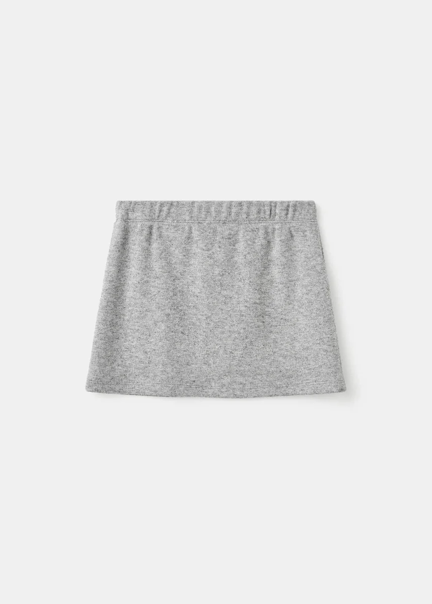Tato sukně z pletené látky má krátký střih do A. Elastický pas zajišťuje pohodlí, zatímco absence zapínání a vnitřní podšívky dodává sukni lehkost.