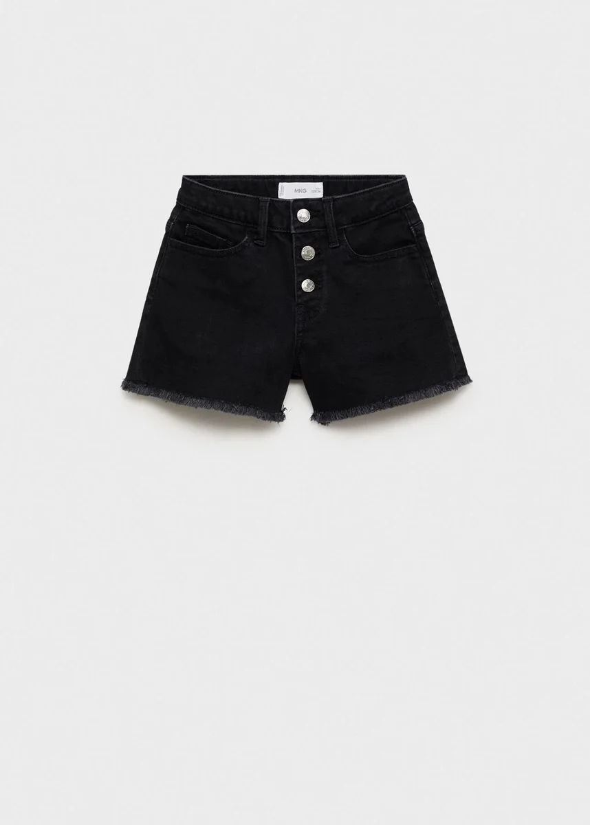 Bavlněná džínovina. Rovný střih. Krátký střih. Tři přední kapsy. Dvě našité kapsy vzadu. Poutka na opasek. Roztřepený lem. Nastavitelný pas. Zapínání na tři knoflíky vpředu