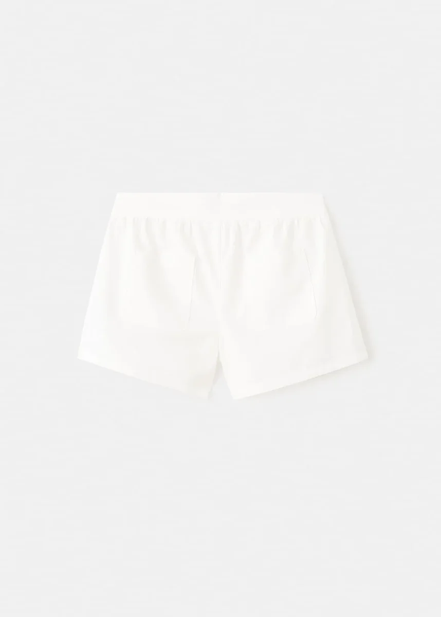 100 % bavlna. Rovný střih. Krátký střih. Elastický pas. Nášivková kapsa na zadní straně