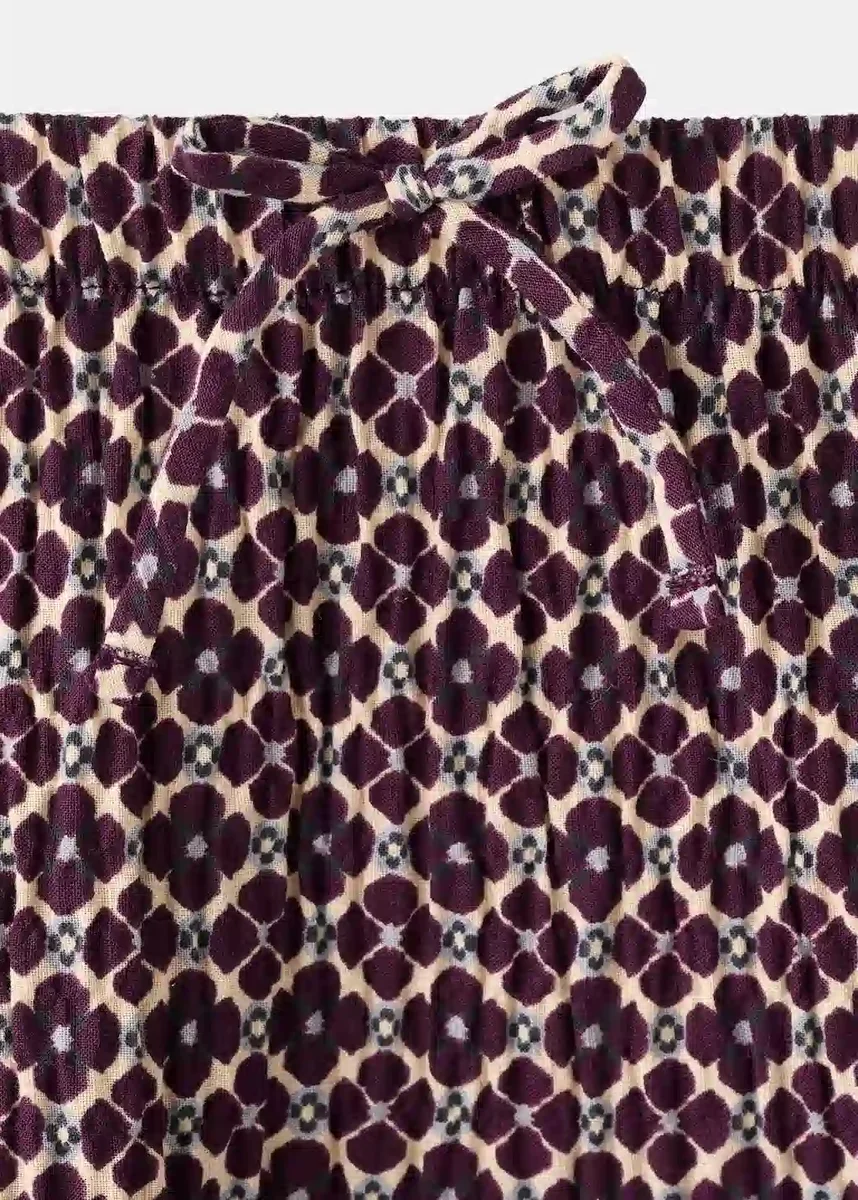 Tato sukně z bavlněné tkaniny má květinový potisk. Je krátká a má elastický pas pro větší pohodlí. Volánky na lemu jí dodávají osobitý vzhled. Bez podšívky