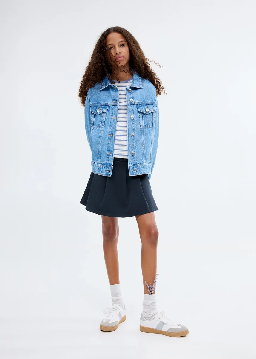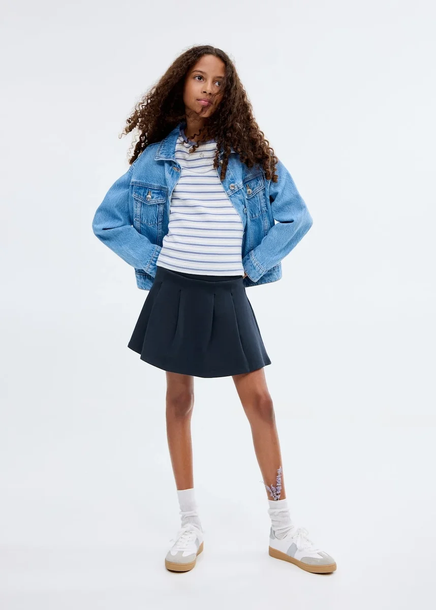 Tento oděv je vyroben z pletené bavlněné látky a má krátký a rovný střih. Dekorativní záhyby dodávají detail, zatímco elastický pas zajišťuje pohodlí. Bez zapínání.