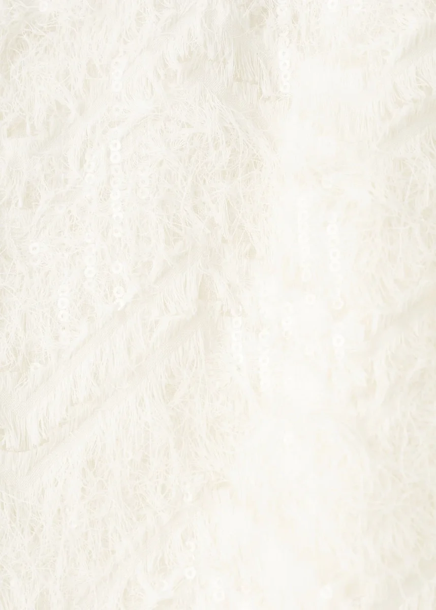 Tato sukně z polyesterové látky má střih do A s třásněmi a flitrovými detaily. Elastický pas zajišťuje pohodlí. Je součástí vánoční a společenské kolekce.
