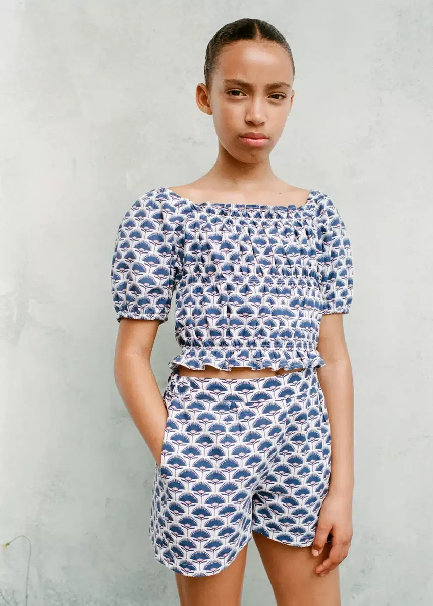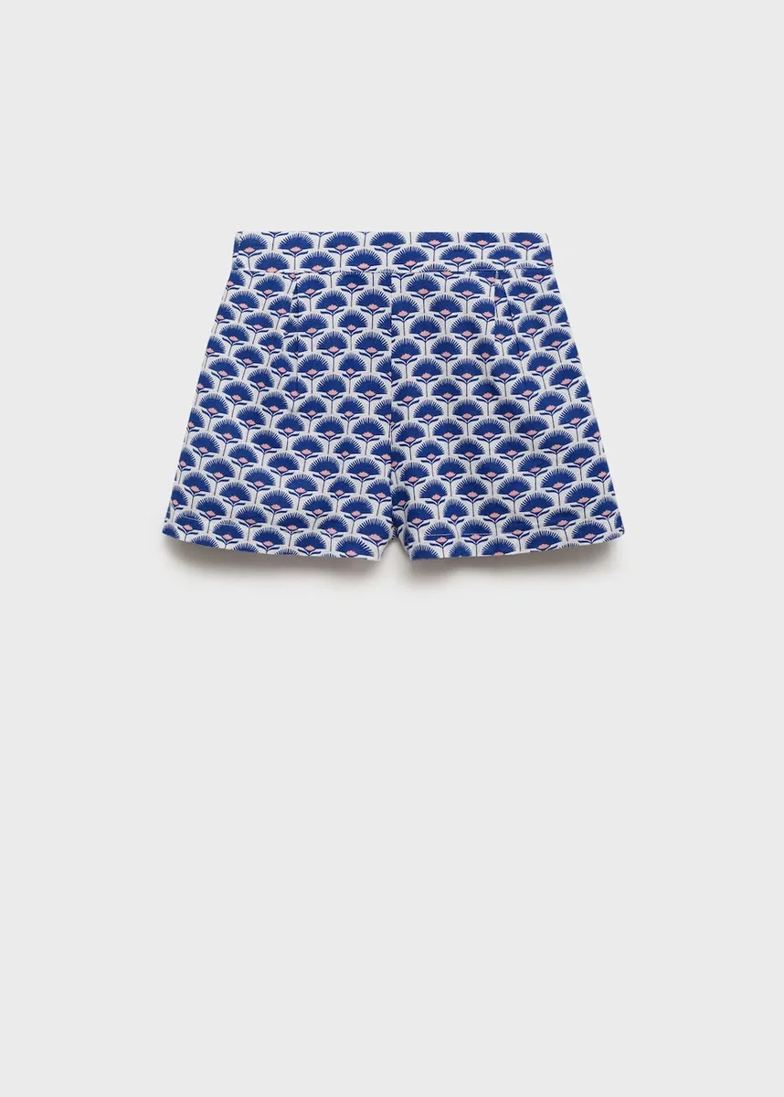 Organická bavlna. Lněná tkanina. Krátký střih. Rovný střih. Květinový potisk. Elastický pas. Celkový vzhled.