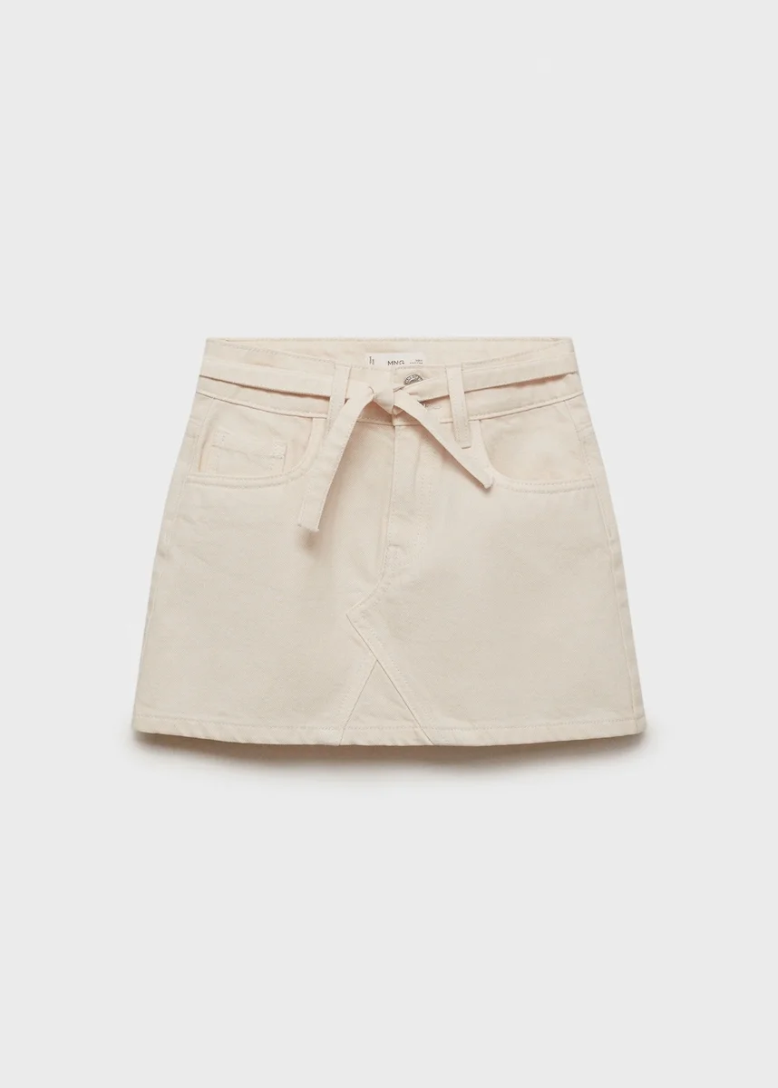 Tato sukně je vyrobena z bavlněné látky v denimovém stylu a má krátký střih s áčkovým siluetou. Má zapínání vpředu na zip a knoflík a mašličku, která jí dodává osobitý vzhled.