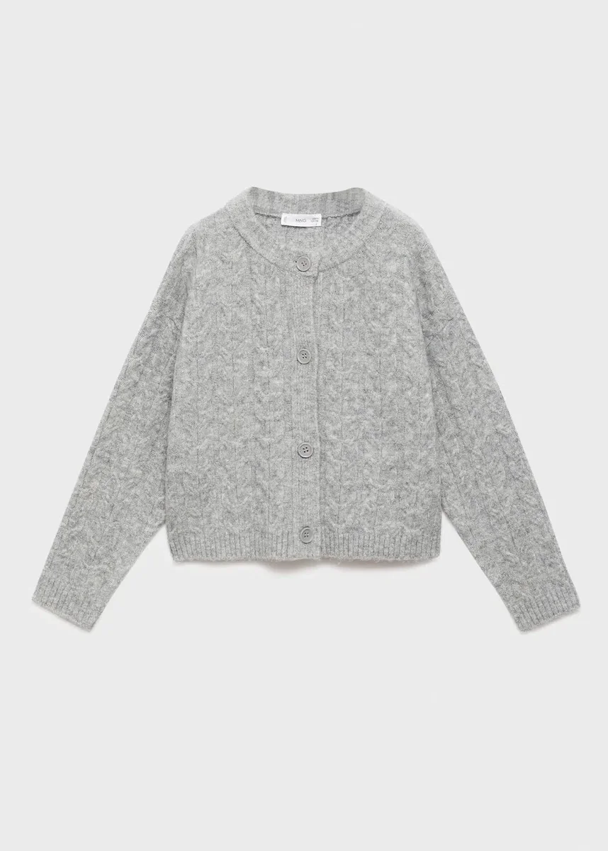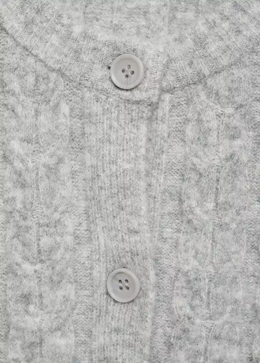 Pletená látka. Rovný střih. Zapínání na knoflíky vpředu. Kulatý výstřih. Dlouhé rukávy. Žebrovaný výstřih, manžety a lem.
